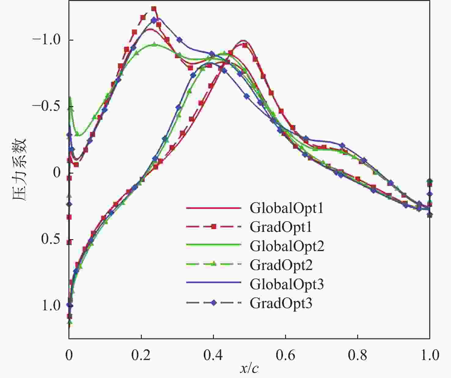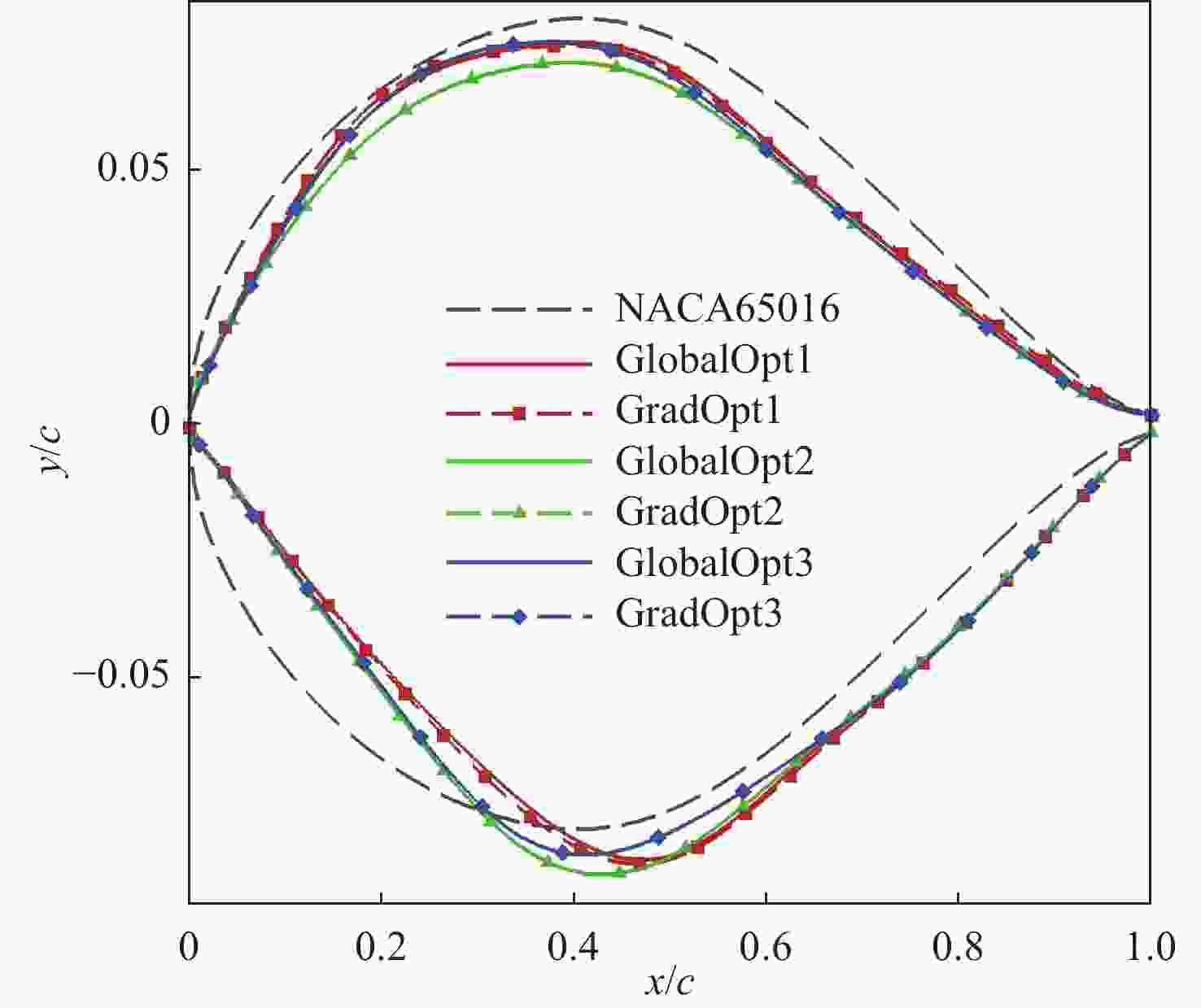 编号 维度 NPF PR R3PSO FER-R3PSO R3PSO FER-R3PSO F1 5 44 44 0.8627 0.8627 10 3 3 0.0588 0.0588 F2 2 204 204 1.0000 1.0000 5 488 539 0.2990 0.3284 8 286 304 0.0219 0.0233 F3 2 1077 1097 0.8447 0.8604 3 2524 2675 0.3959 0.4196 4 6127 7392 0.1922 0.2319 F4 5 20 21 0.3922 0.4118 10 0 0 0 0 F5 2 1035 1064 0.8118 0.8345 3 2462 2677 0.3862 0.4199 4 6072 7024 0.1905 0.2204 F6 4 475 579 0.5821 0.7096 6 850 1216 0.2604 0.3725 8 1434 2055 0.1098 0.1574 F7 6 338 366 0.8284 0.8971 10 504 587 0.3088 0.3597 16 485 506 0.0371 0.0388 F8 2 678 697 0.3693 0.3796 3 1614 1856 0.1465 0.1685 4 3733 4589 0.0565 0.0694 表 5 NACA65016外形全局/梯度优化结果
