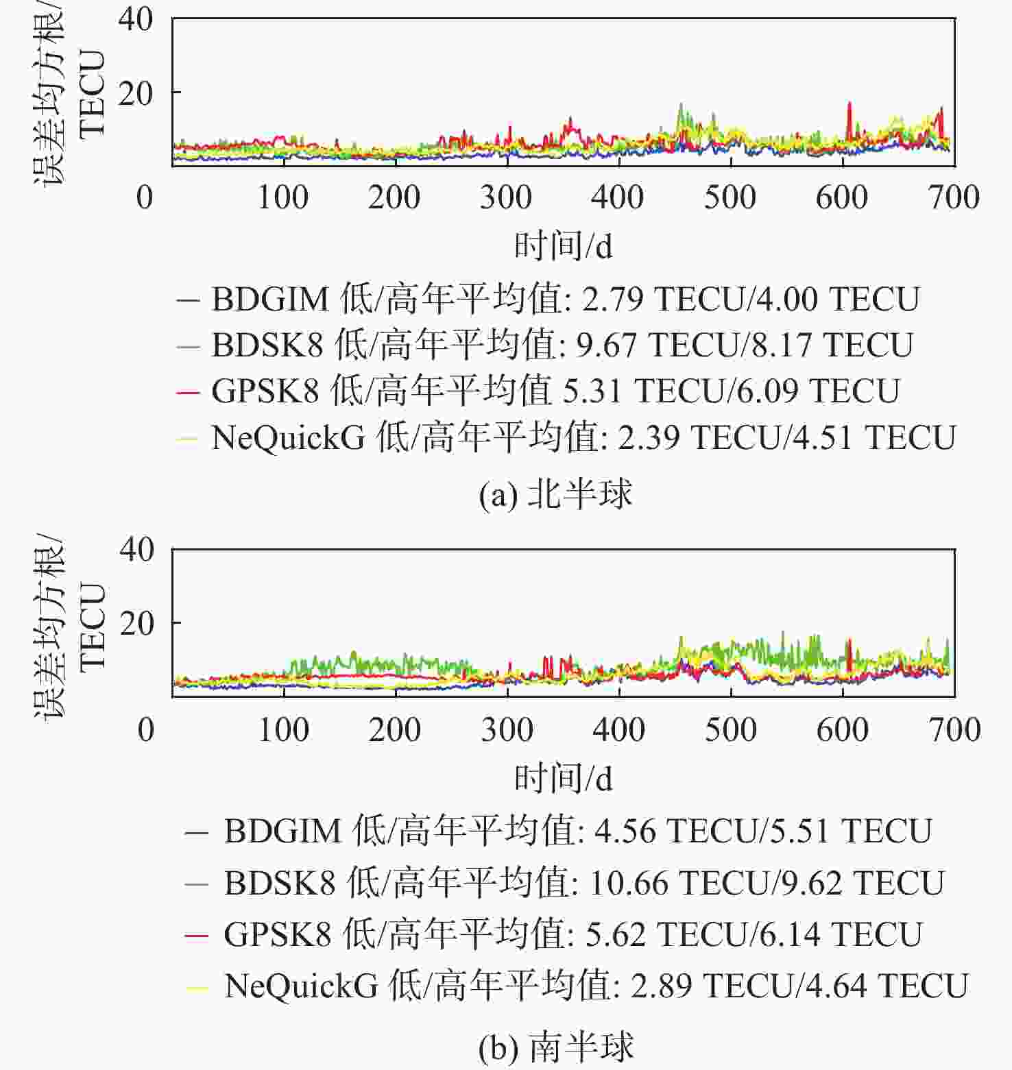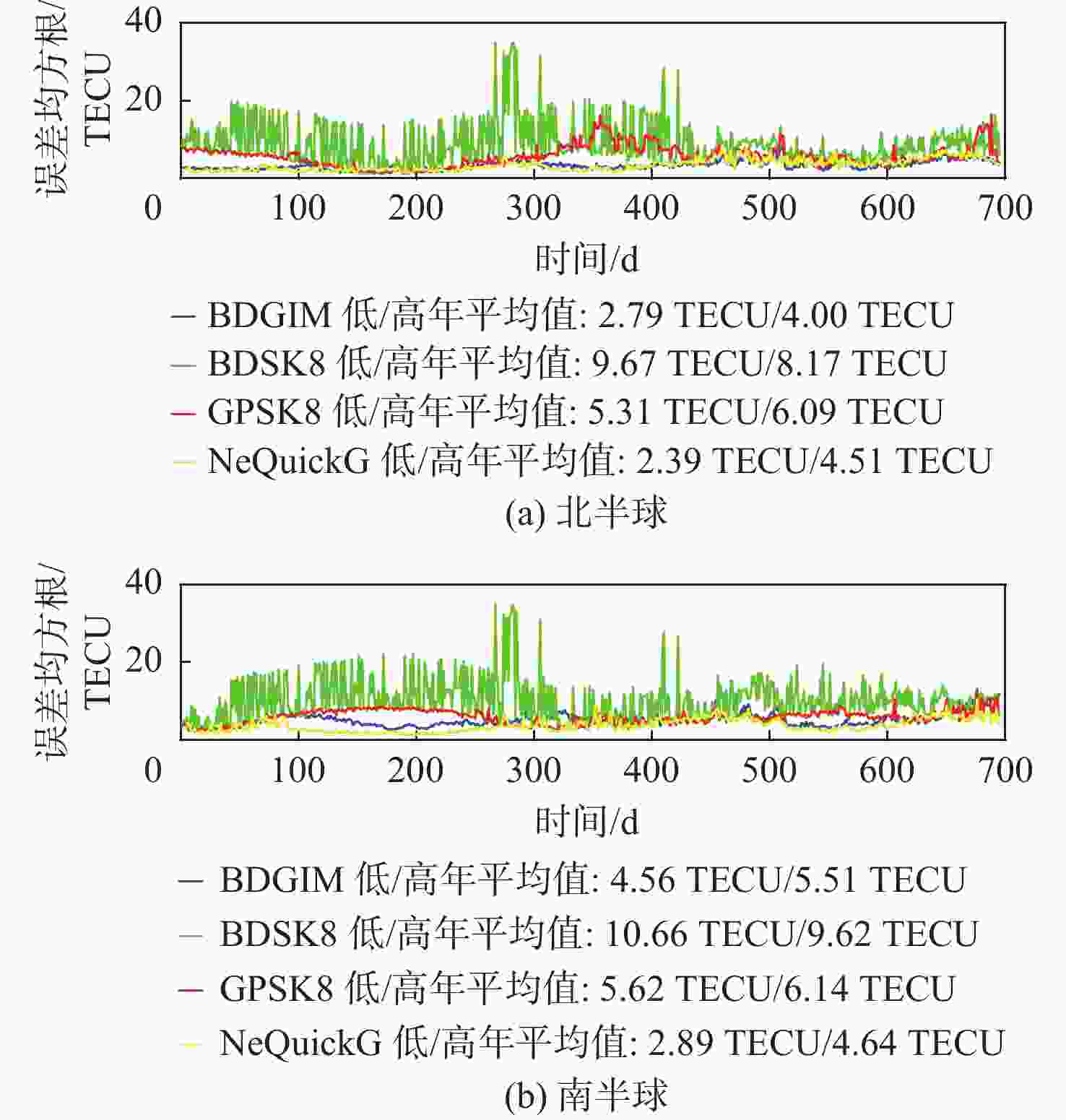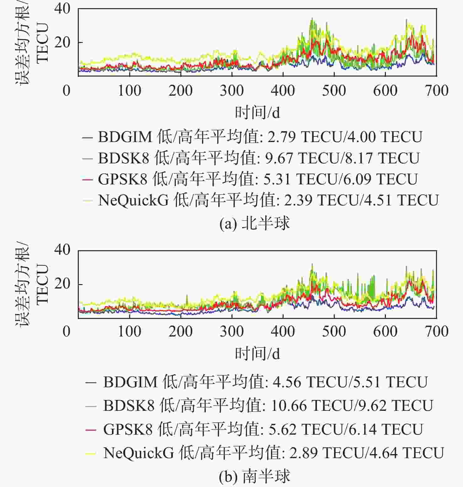 模型 纬度 RMSE RE/% BDSK8 低 5.20 36 中 1.43 15 高 3.23 26 GPSK8 低 6.20 46 中 3.90 31 高 5.30 42 NeQuickG 低 4.60 17 中 2.27 18 高 1.47 21 BDGIM 低 2.13 18 中 1.23 15 高 1.47 14 -
