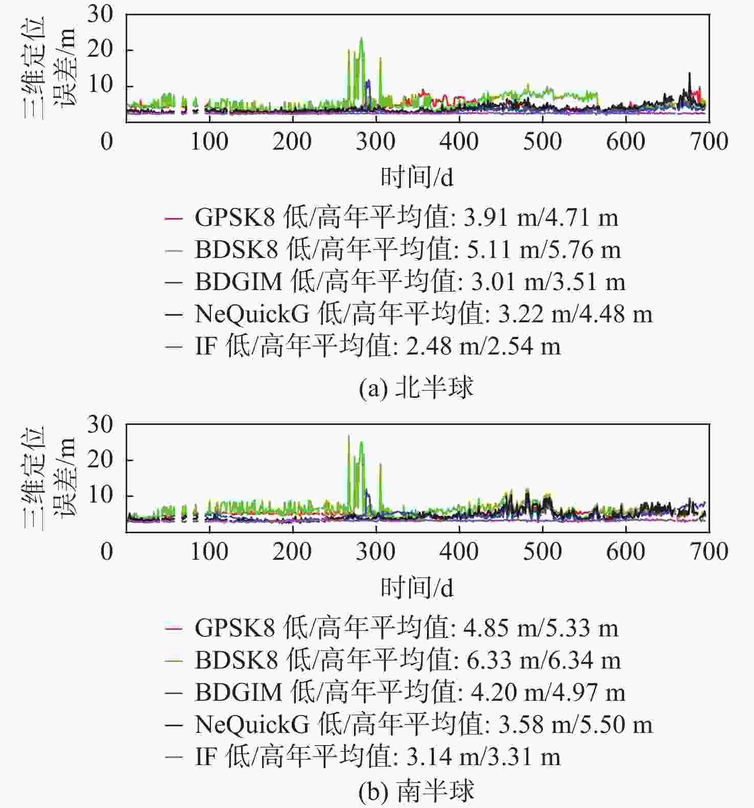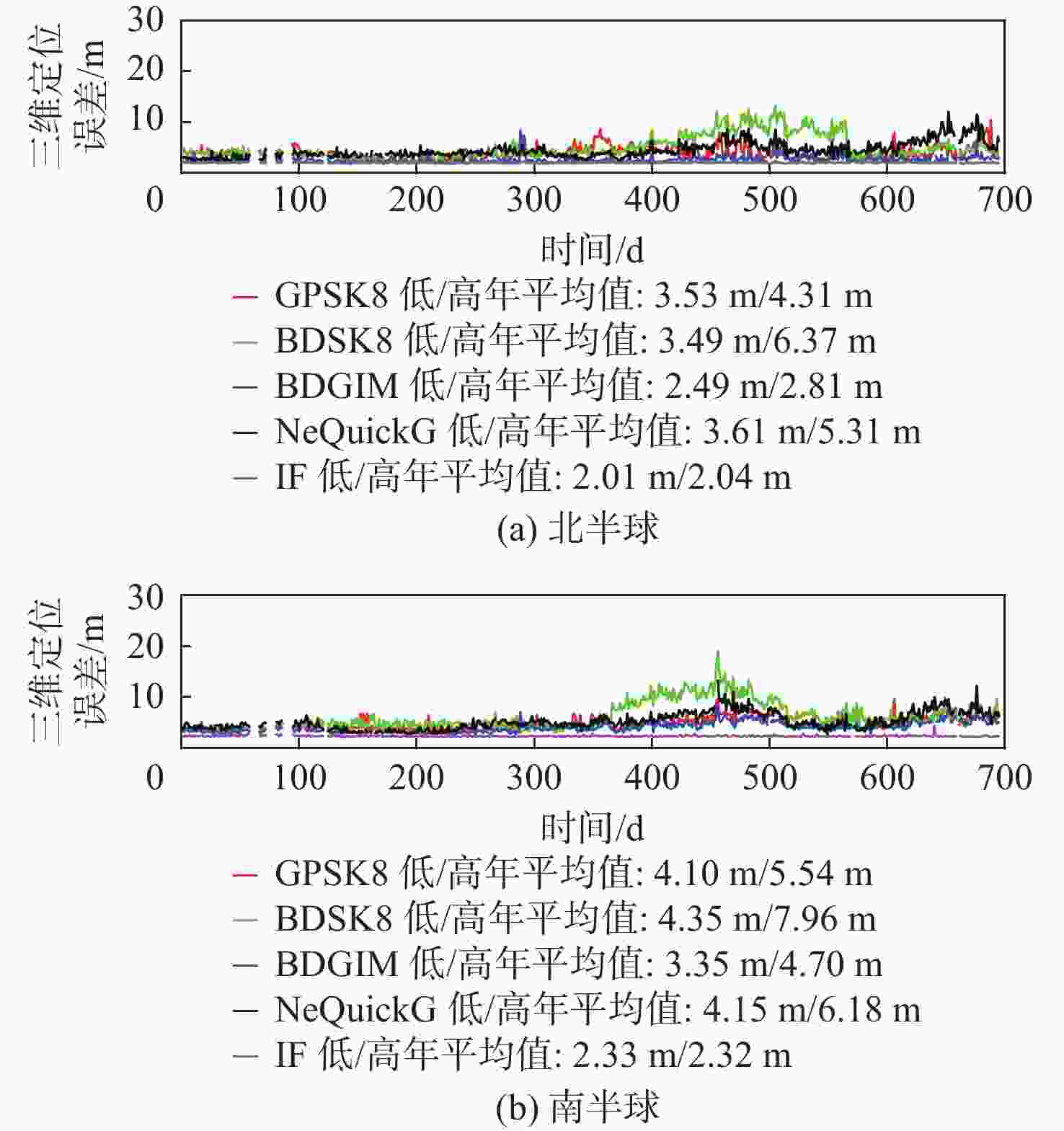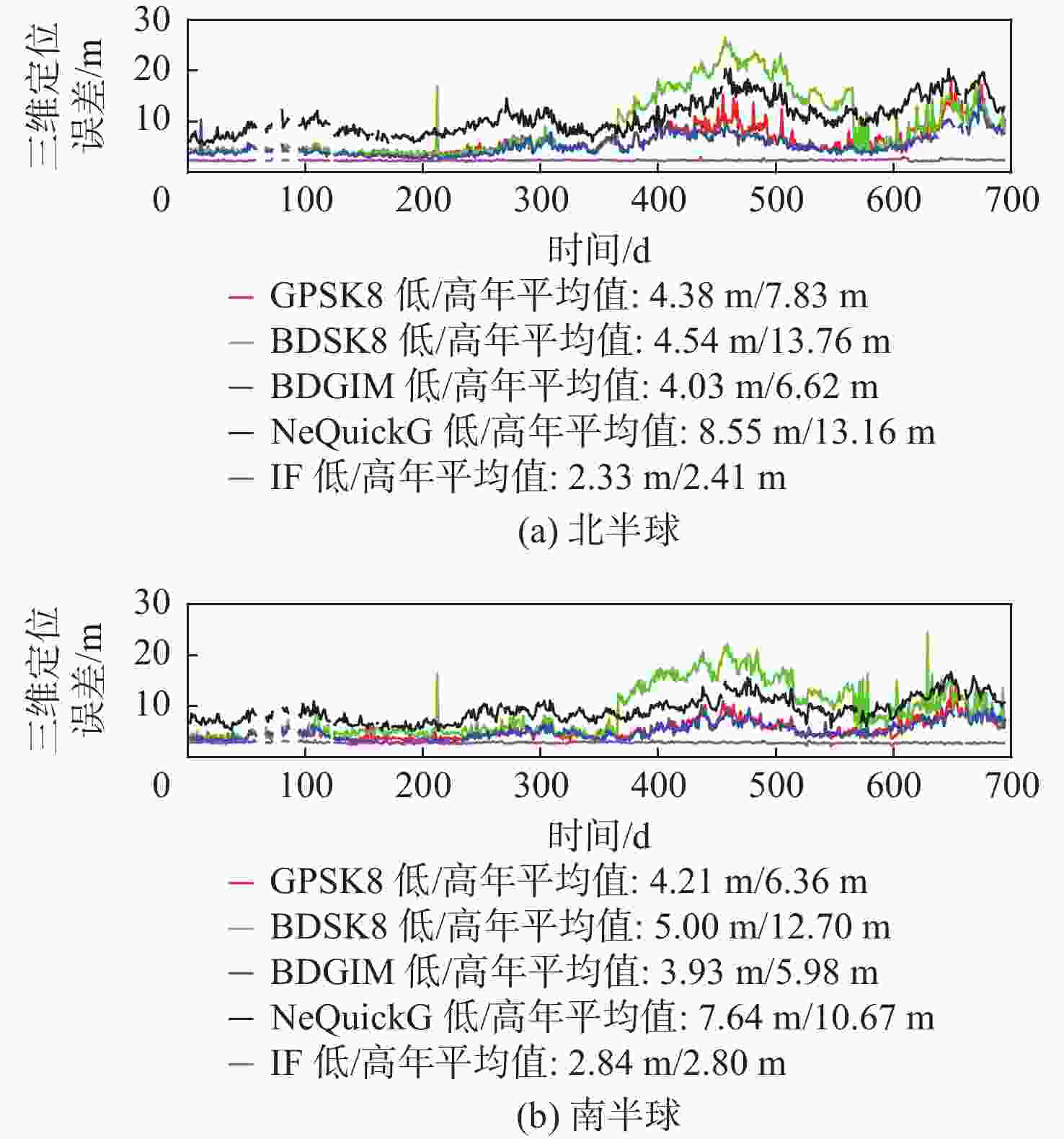 为评估现有全球导航卫星系统(GNSS)中广播电离层模型性能,利用国际GNSS服务(IGS)分析中心提供的事后全球电离层图(GIM)产品,对北斗系统、全球定位系统(GPS)、Galileo系统的广播电离层模型进行了电离层总电子含量(TEC)域及定位域的长期精度评估。发现在太阳活动爬坡过程中,北斗Klobuchar八参数模型(BDSK8)、GPS Klobuchar八参数模型(GPSK8)、北斗全球广播电离层模型(BDGIM)及NeQuickG 4种模型的精度均有一定程度的下降,在不同纬度带也表现出不同的特性。结果表明:BDGIM性能最优,在3个纬度带的误差均方根(RMS)均值分别上升至7.27、4.43、4.00 TECU,三维定位误差分别上升至6.62、2.81、3.51 m;BDSK8受太阳活动影响最大,RMS的放大系数可达4~5倍。利用Bagging回归树学习器对各广播电离层模型误差和空间物理参数进行了建模和预报,其中,BDGIM模型预测效果最优,3个纬度带的均方根误差(RMSE)分别为2.13、1.23、1.47 TECU,相对误差(RE)分别为18%、15%、14%;NeQuickG模型次之,RMSE分别为4.60、2.27、1.47 TECU,RE分别为17%、18%、21%;2种Klobuchar模型精度的预报效果不佳。