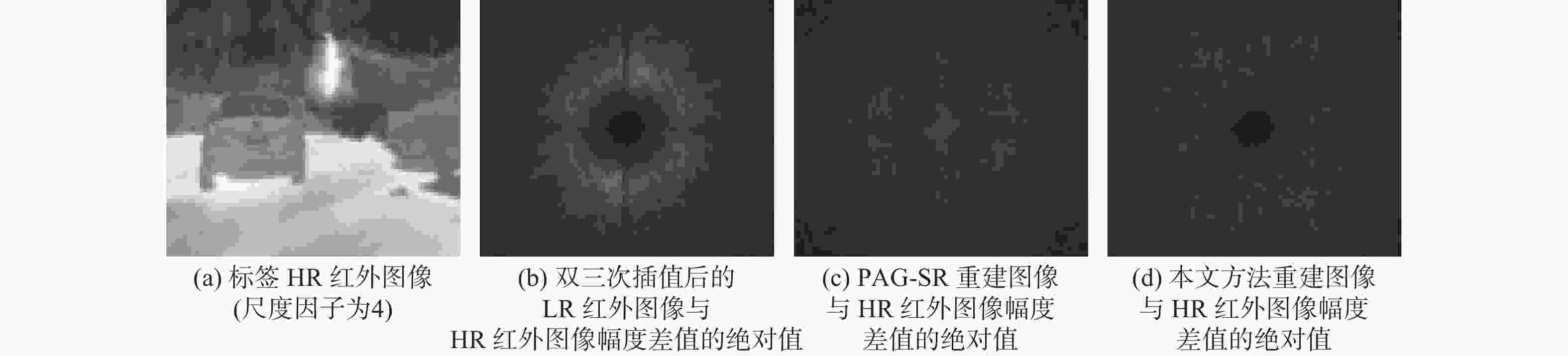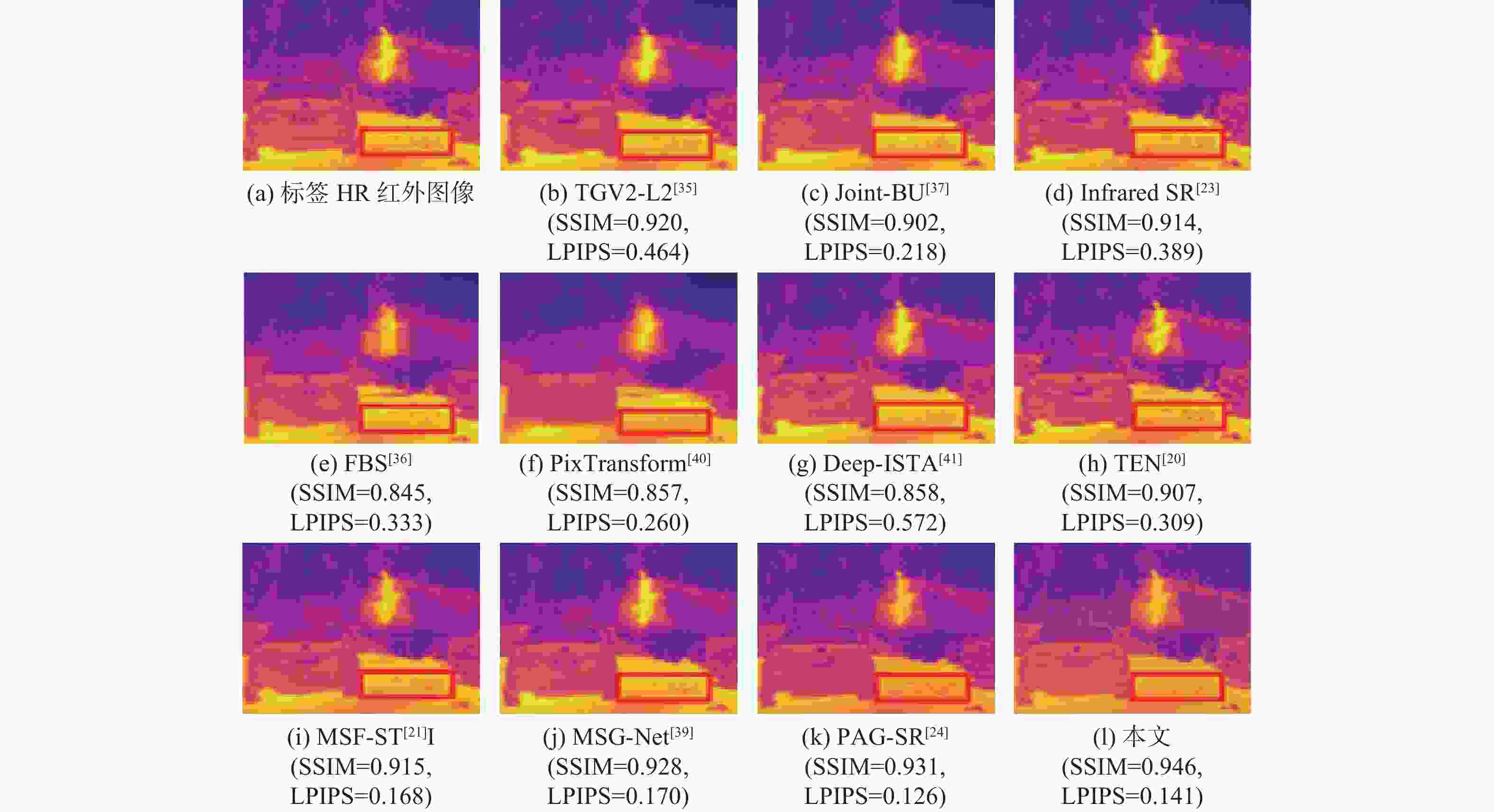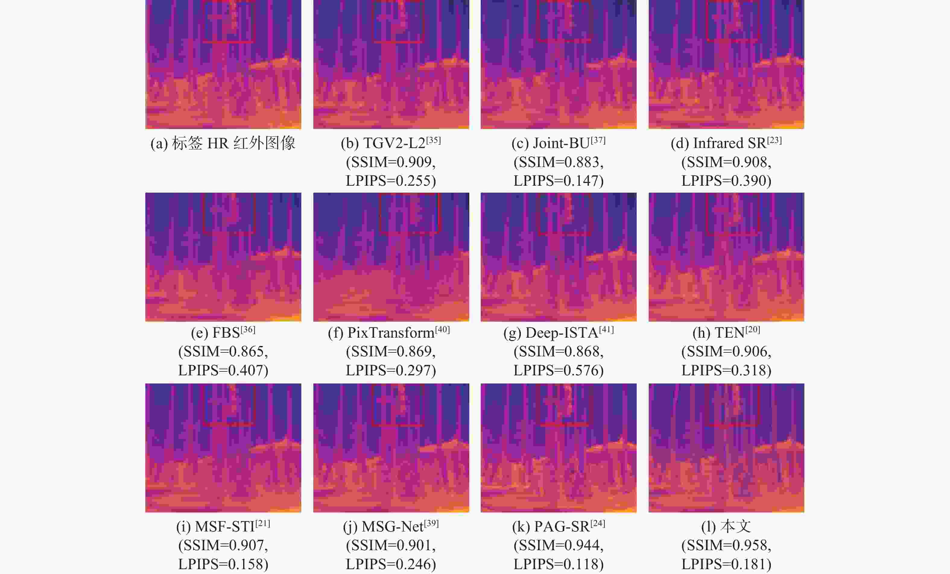 方法 是否引导 PSNR/dB SSIM LPIPS 尺度因子为4 尺度因子为8 尺度因子为4 尺度因子为8 尺度因子为4 尺度因子为8 RDN[14] 非引导 29.28 26.80 0.906 0.833 0.282 0.389 RCAN[33] 非引导 29.18 22.35 0.908 0.758 0.228 0.414 SAN[34] 非引导 26.47 25.38 0.859 0.811 0.229 0.536 TGV2-L2[35] 引导 28.77 26.42 0.892 0.821 0.422 0.399 FBS[36] 引导 25.48 25.03 0.787 0.770 0.387 0.476 Joint-BU[37] 引导 27.77 25.61 0.874 0.803 0.284 0.406 Infrared SR[23] 引导 28.21 26.03 0.889 0.817 0.405 0.521 SDF[38] 引导 28.70 26.72 0.875 0.819 0.321 0.363 MSF-SR[13] 引导 29.21 27.92 0.901 0.835 0.200 0.249 MSG-Net[39] 引导 29.46 27.29 0.897 0.827 0.184 0.296 PixTransform[40] 引导 24.84 23.31 0.787 0.836 0.329 0.371 Deep-ISTA[41] 引导 25.86 25.56 0.828 0.778 0.529 0.598 PAG-SR[24] 引导 29.56 28.77 0.912 0.919 0.147 0.214 本文 引导 31.05 30.66 0.921 0.920 0.189 0.283 -