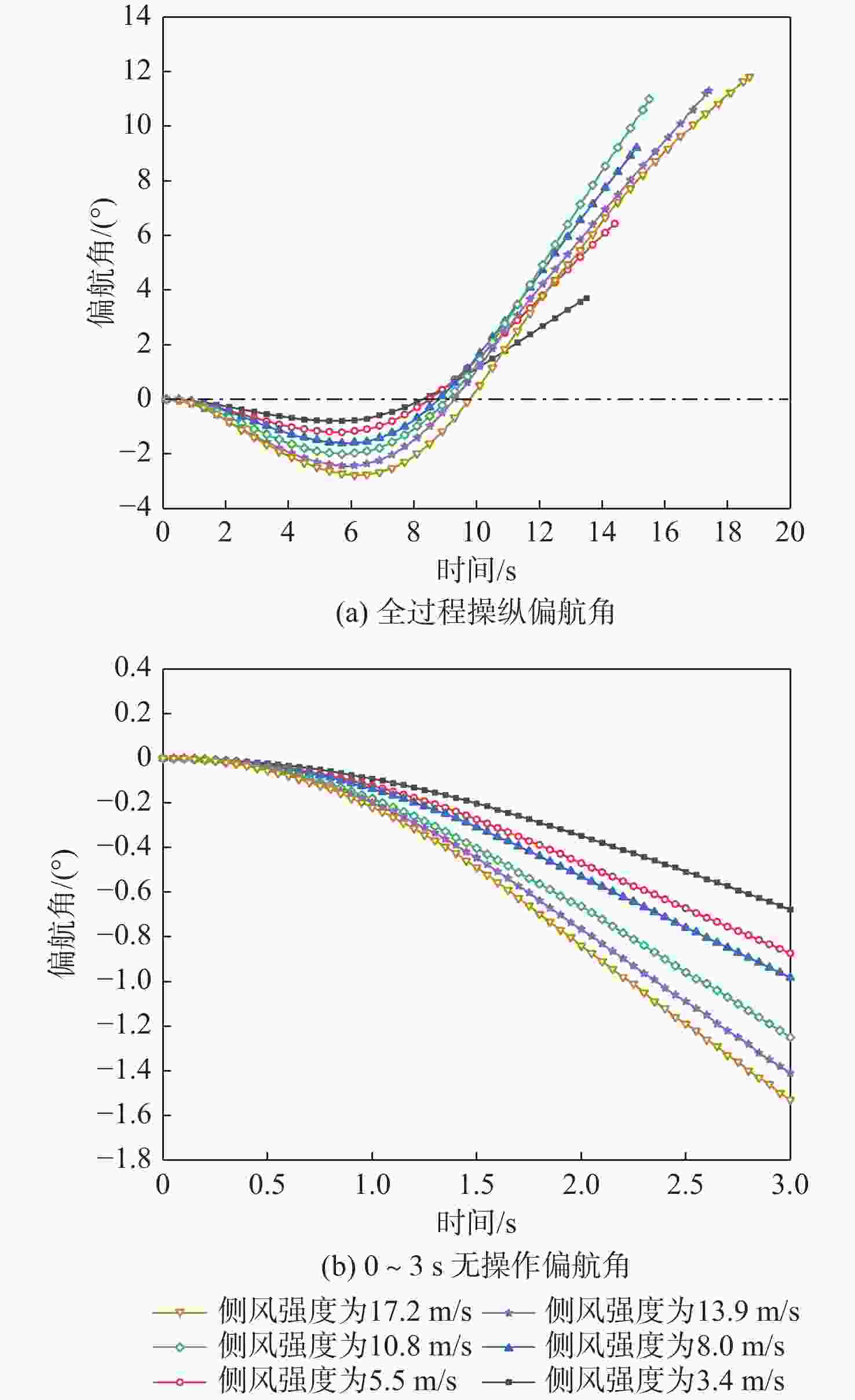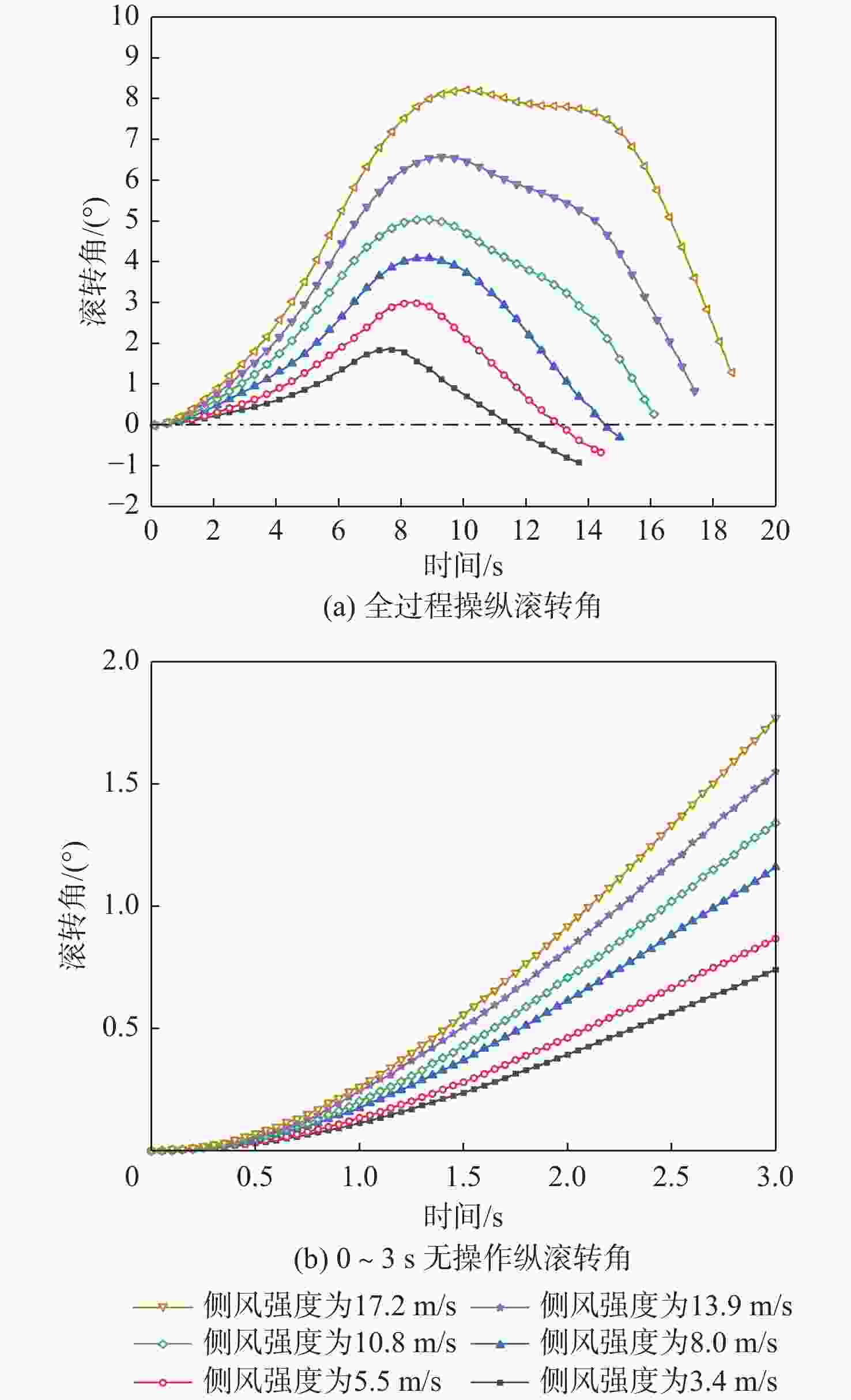 侧风强度/(m·s−1) 偏航角差值/(°) 3.4 0.20 5.5 0.17 8.0 0.14 10.8 0.12 13.9 0.10 17.2 0.07 表 8 有/无驾驶员操纵状况下3 s时滚转角差值