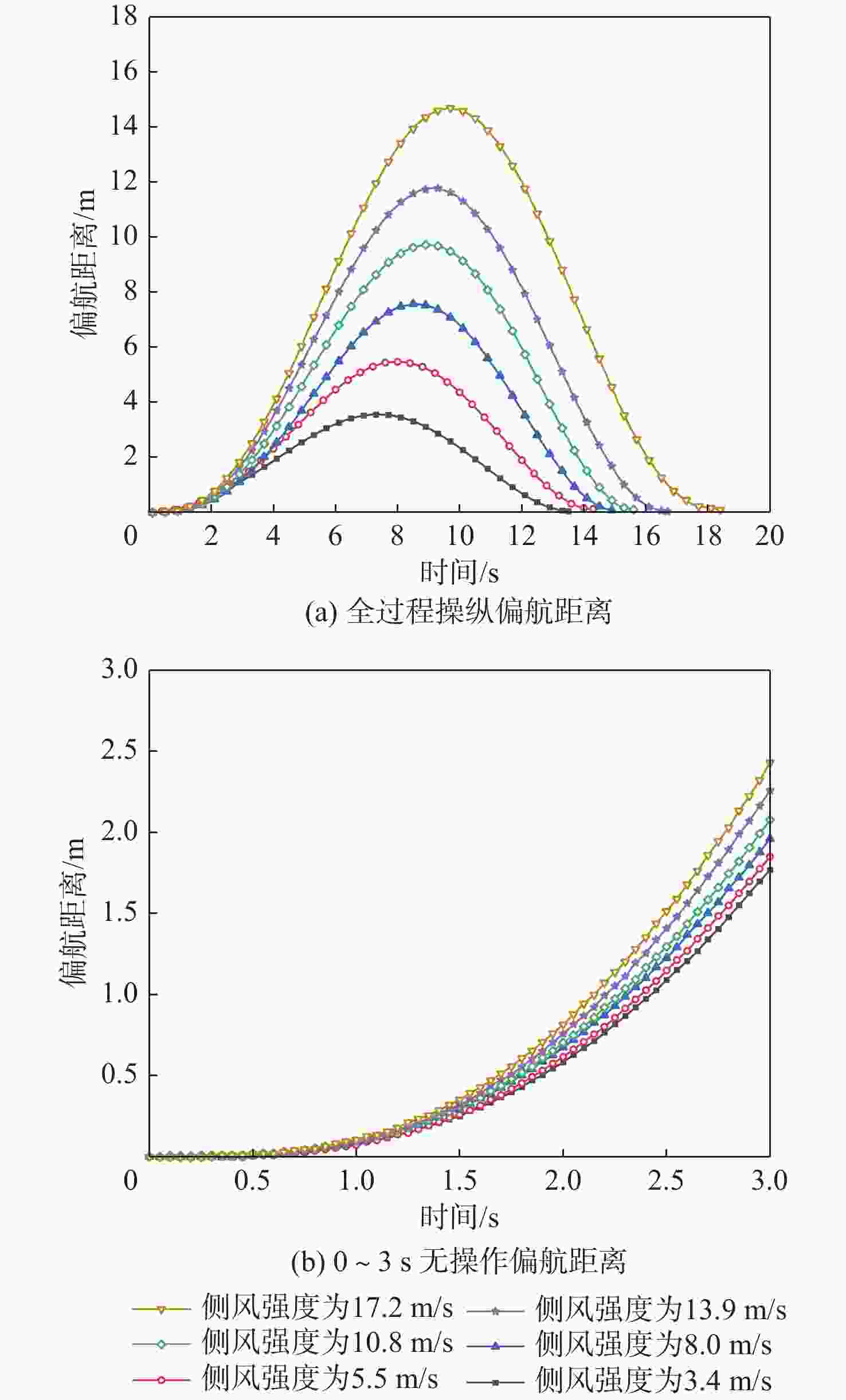 侧风强度/(m·s−1) 偏航距离峰值/m 偏航距离增量 3.4 3.55 5.5 5.47 1.92 8.0 7.57 2.10 10.8 9.71 2.14 13.9 11.77 2.06 17.2 14.69 2.92 表 10 有/无驾驶员操纵状况下3 s时偏航距离差值