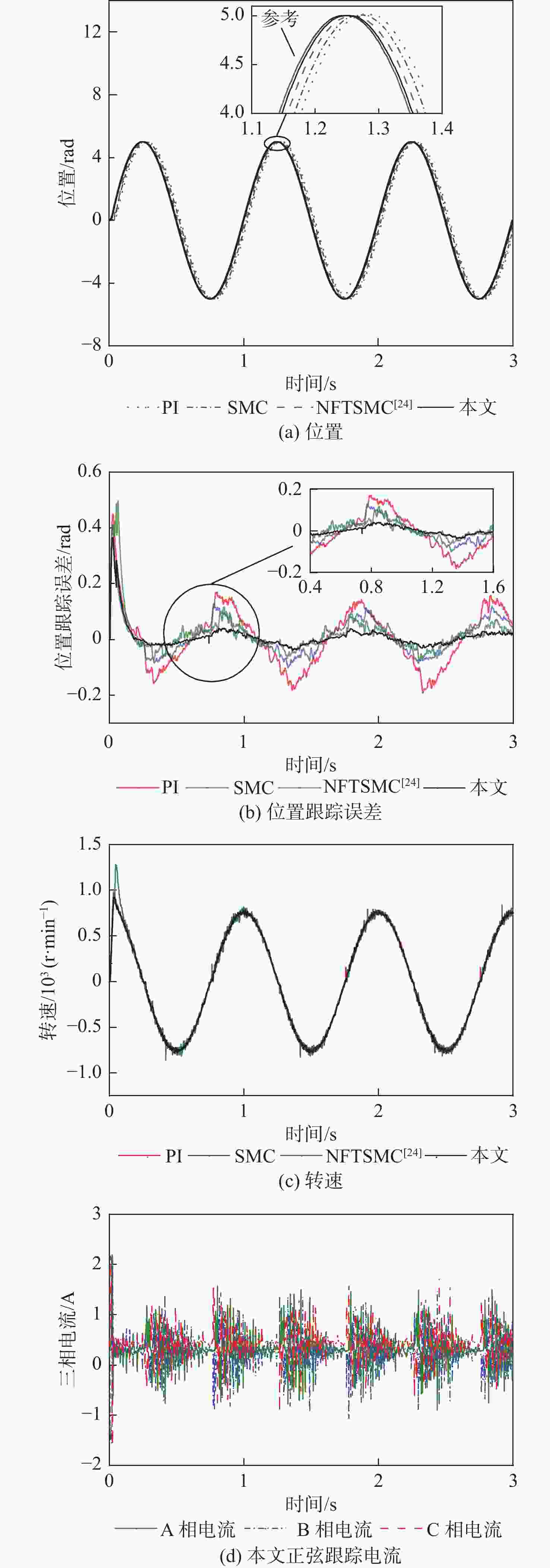 参数 数值 输出额定功率/W 400 额定转速/(r·min−1) 3000 额定电压/V 60 额定电流/A 8.5 极对数 4 定子电阻/$ \Omega $ 0.19 定子电感/$ {\rm H} $ 0.00065 转子磁链/$ {\text{Wb}} $ 0.018 转动惯量/($ {\text{kg}} \cdot {{\text{m}}^{\text{2}}} $) 0.0000342 阻尼系数/(N·s·m−1) 0.0001 表 2 位置跟踪误差分析数据