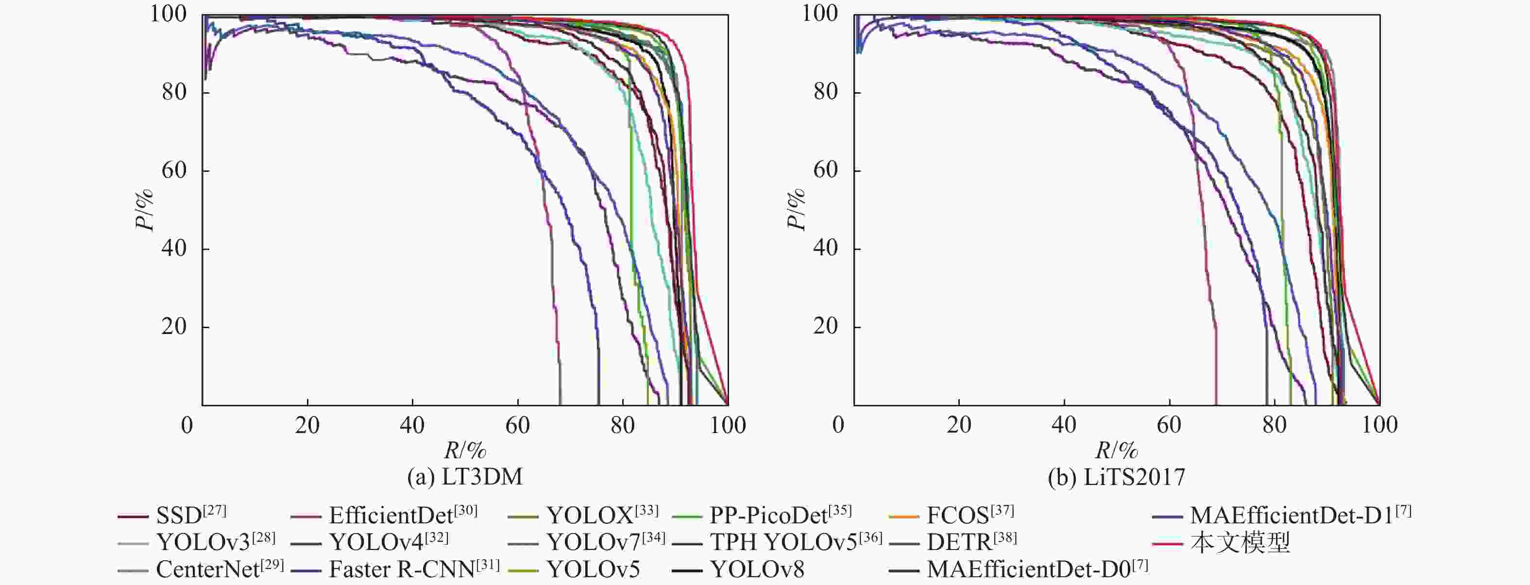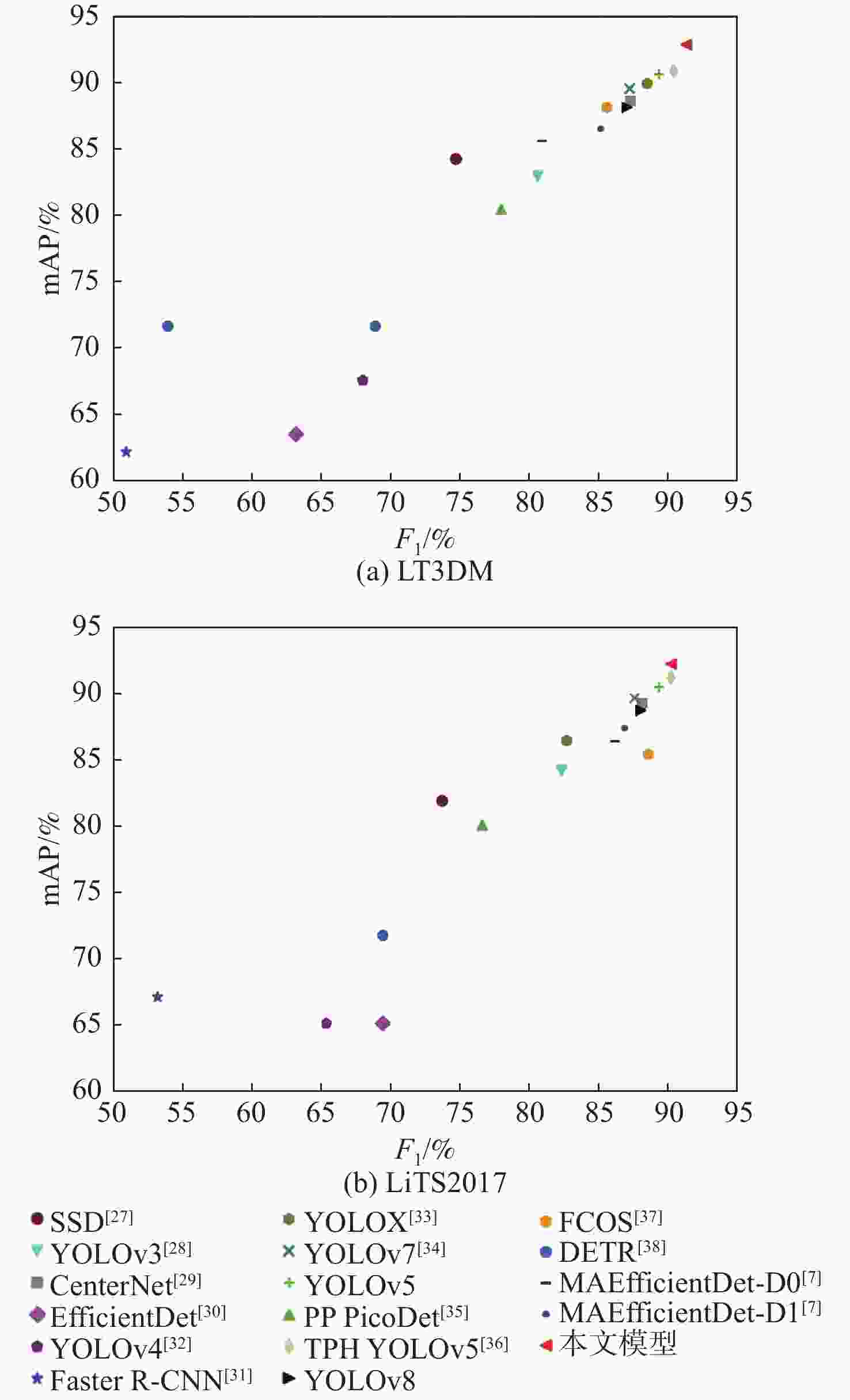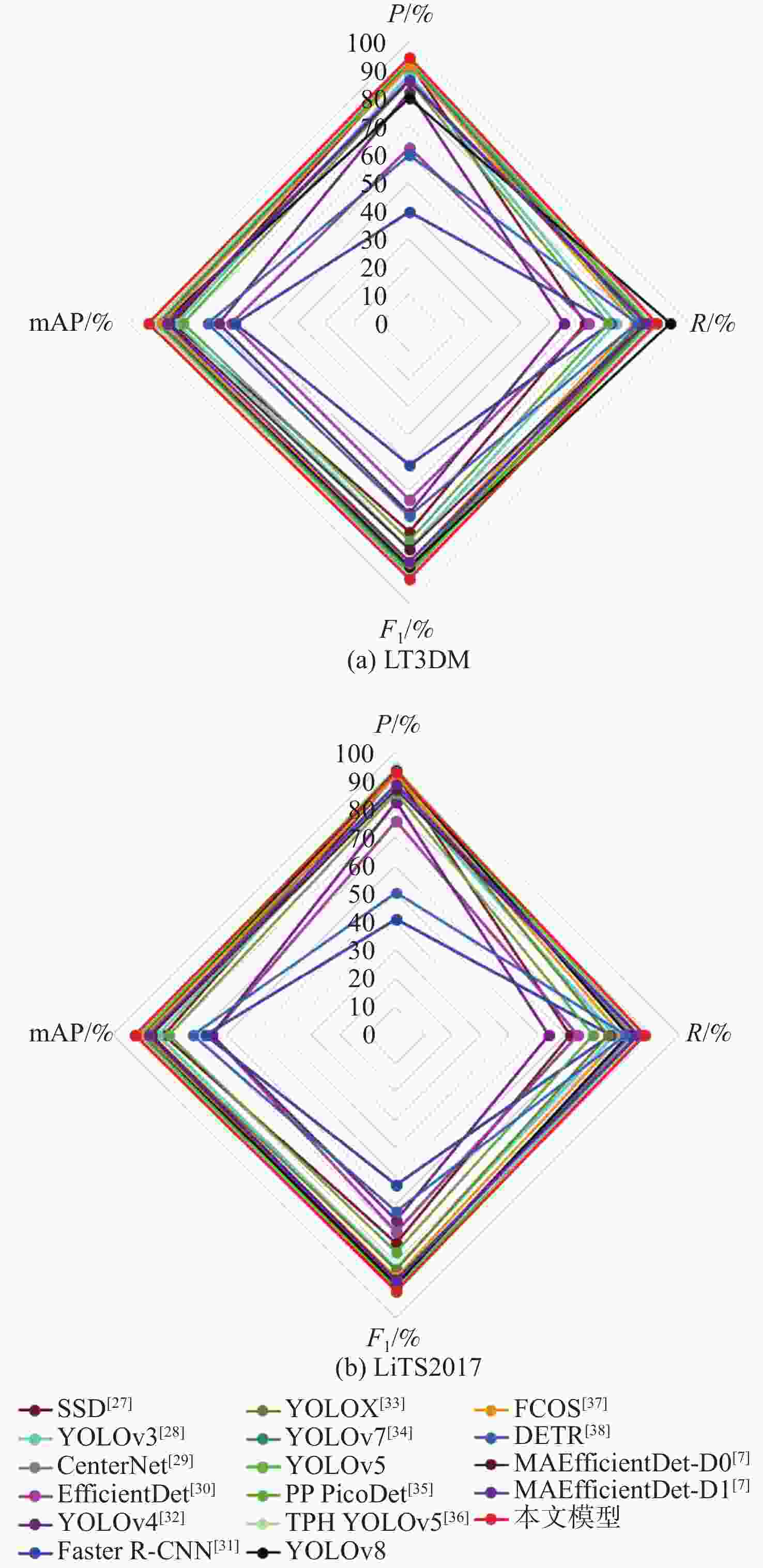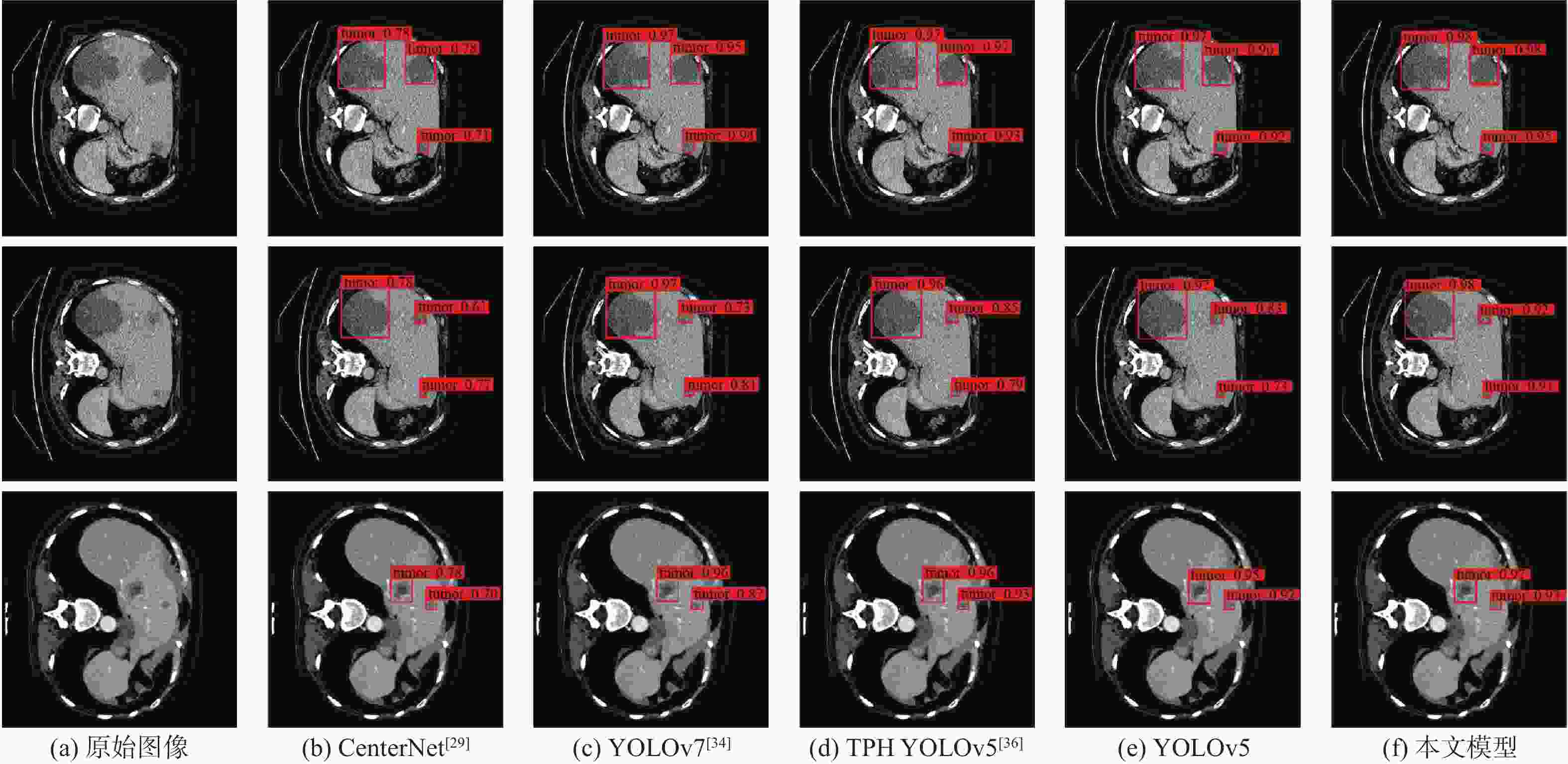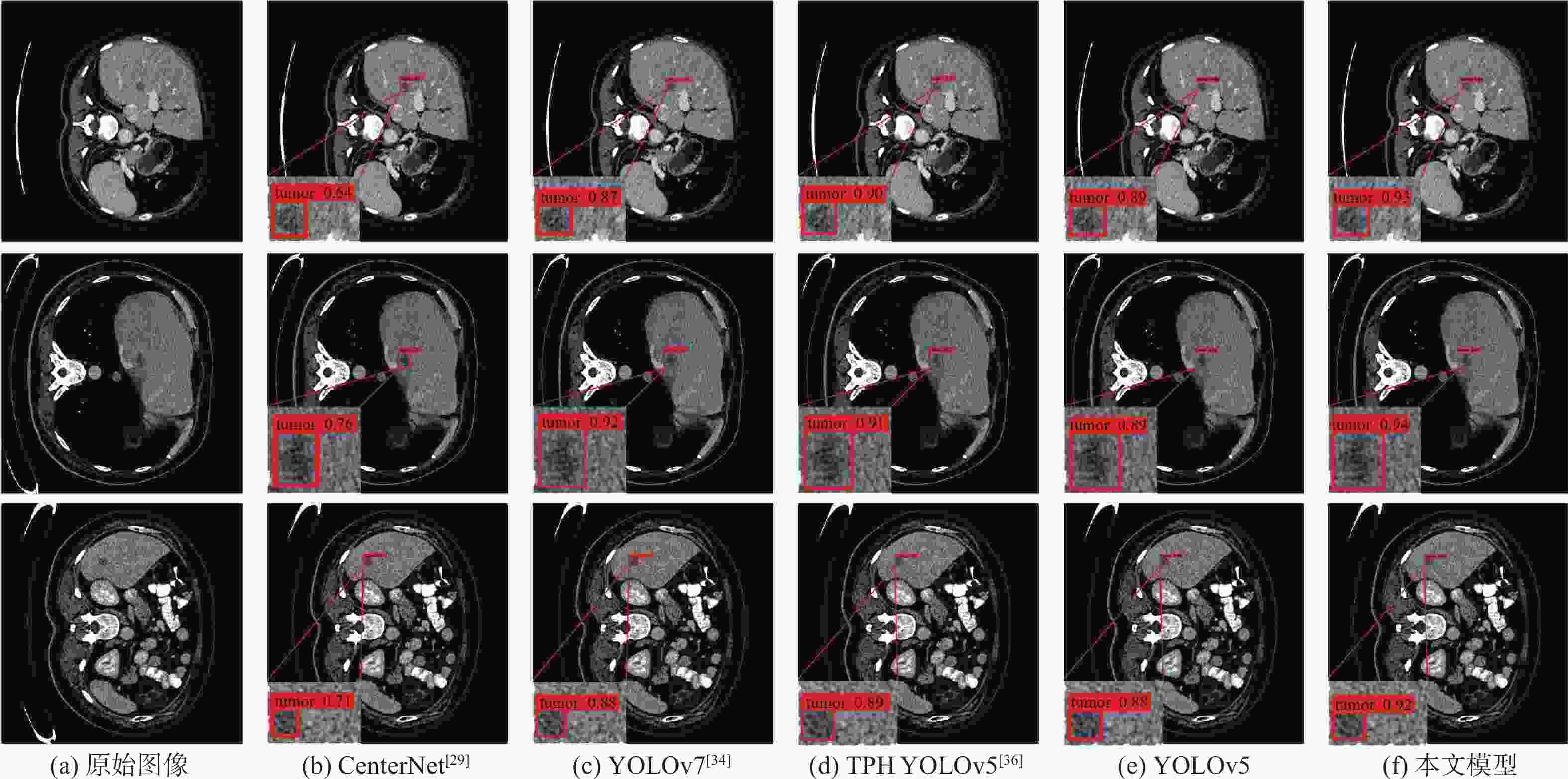 109 s−1SSD512(VGG) [27] 93.1 62.5 74.7 84.3 23.75×106 87.55 YOLOv3[28] 88.7 73.9 80.6 82.9 61.52×106 49.68 CenterNet[29] 92.8 82.5 87.3 88.6 32.66×106 35.09 EfficientDet[30] 62.5 63.9 63.2 63.5 3.83×106 2.37 YOLOv4[32] 82.4 55.2 68.0 67.6 63.94×106 45.41 Faster R-CNN(Res50) [31] 39.4 71.8 50.9 62.2 28.28×106 241.71 YOLOX[33] 91.5 85.8 88.5 89.9 8.94×106 8.56 YOLOv7[34] 92.8 82.2 87.2 89.6 6.22×106 33.01 YOLOv5 93.6 85.7 89.4 90.6 7.02×106 15.90 PP PicoDet[35] 86.1 71.2 77.9 80.5 1.18×106 4.59 TPH YOLOv5[36] 94.2 86.9 90.4 90.9 40.82×106 36.26 YOLOv8 80.1 93.3 87.0 88.1 11.13×106 9.10 FCOS[37] 91.9 80.1 85.6 88.1 32.11×106 51.56 DETR[38] 59.8 81.3 68.9 71.7 36.74×106 23.81 MAEfficientDet-D0[7] 86.2 84.1 80.9 85.6 4.34×106 2.83 MAEfficientDet-D1[7] 86.8 84.8 85.1 86.5 7.08×106 6.81 本文模型 94.6 88.3 91.3 92.9 7.17×106 16.30 表 7 不同模型在LiTS2017上的检测性能对比