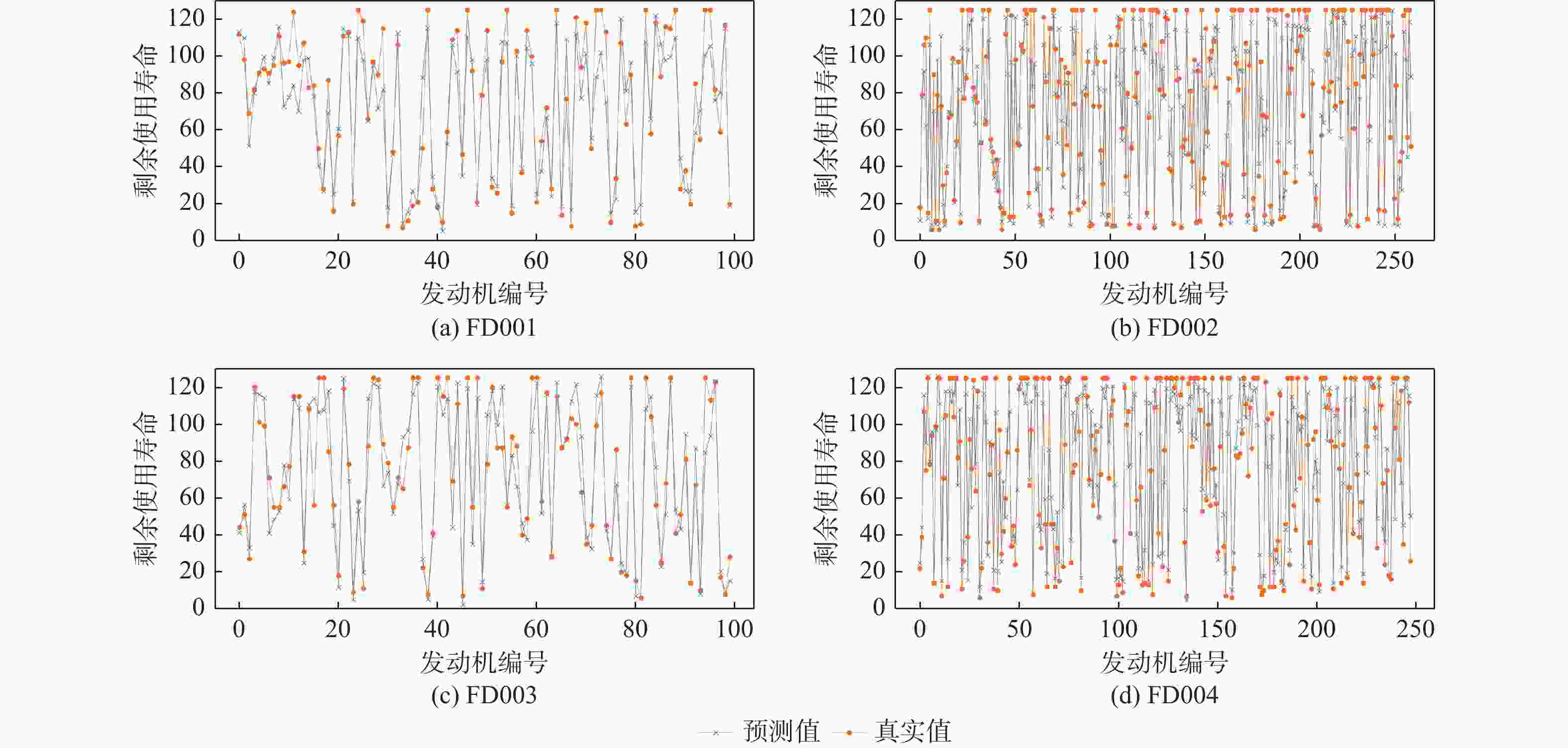 方法 RMSE Score FD001 FD002 FD003 FD004 FD001 FD002 FD003 FD004 DCNN[5] 12.61 22.36 12.64 23.31 273.7 10412 284.1 12466 Bi-LSTM[8] 25.11 26.61 4793 4971 HDNN[9] 13.01 15.24 12.22 18.156 245 1282.42 287.72 1527.42 BGRU-TSAM[10] 12.56 18.92 12.45 20.47 213.35 2264.13 232.86 3610.34 Dual-Att[12] 12.25 17.08 13.39 19.68 198 1575 290 1741 BSVAR 12.39 14.88 13 15.52 246.58 854.11 317.51 1160.17 EN[14] 13.58 19.59 19.16 22.15 228 2650 1727 2901 RVE[20] 13.42 14.92 12.51 16.37 323.82 1379.17 256.36 1845.99 表 4 所选4台发动机的RUL值