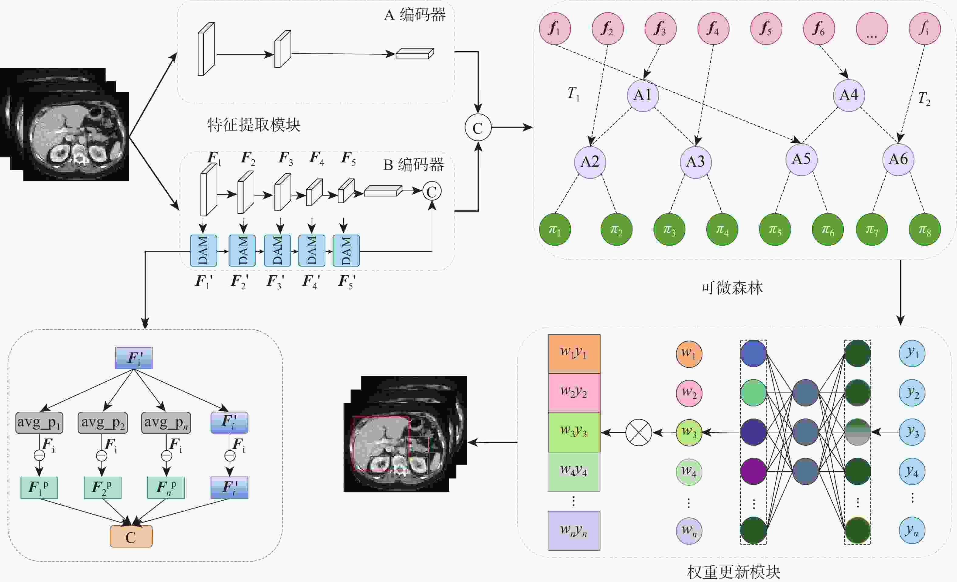 针对传统随机森林方法在处理高维、结构复杂医学图像数据特征学习不充分问题,提出一种基于深度可微随机森林的腹部多器官检测方法。所提方法先将深度学习和随机森林进行巧妙地融合,使用全局-局部双编码器提取高层特征,再将特征输入到可微随机森林进行树分裂。所设计的决策注意力为每棵决策树分配权重,利用反向传播学习参数,构造最终的端到端的检测模型。与传统随机森林不同的是,所提方法采用概率的形式进行树节点分裂,多棵决策树以参数权重进行投票。这种反向传播学习节点分裂参数和投票权重参数策略,可以避免传统随机森林叶节点分裂造成的局部最优,使深度可微随机森林能寻找出全局最优值。在2个公共医学图像多器官数据集(AbdomenCT-1K、AMOS2022)上进行了实验,在AbdomenCT-1K中5个腹部器官的平均WD值比对比方法减少了0.7~2.66 mm,在AMOS2022中7个腹部器官的平均WD值比对比方法减少了0.67~2.68 mm。结果表明:所提方法具有较高的检测准确性。