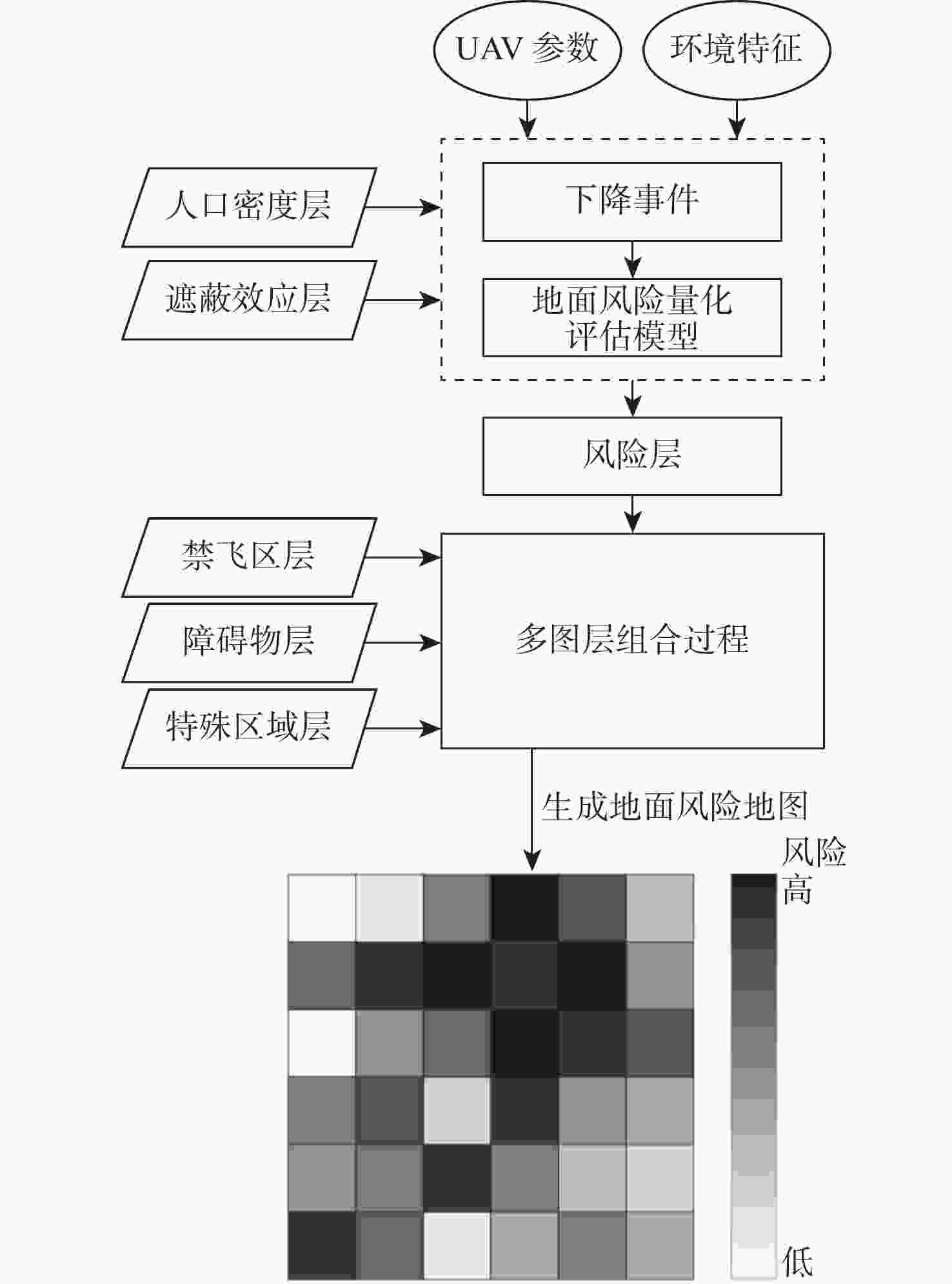 为保证无人机(UAV)在城市低空安全运行,构建UAV运行的地面风险量化评估模型,提出使用考虑多因素多层次的对地风险地图,来定义与UAV相关的对地风险,量化风险程度。分析城市低空典型特征和UAV坠地事故因果链,建立多因素影响下的地面风险量化评估模型;考虑UAV的下降行为和风参数的不确定性,计算UAV坠地的影响区域概率密度函数;通过结合城市区域地图、人口密度、遮蔽效应、障碍物和禁飞区多个图层,计算每个地理参考单元的风险值,生成大区域范围的地面风险地图。基于真实算例对所建模型进行验证分析,结果表明:不同城市区域的风险分布区别明显,风险程度与人口密度分布、地表遮蔽效果、地面障碍物高度分布、城市禁飞区的划设及UAV飞行高度密切相关;UAV在运行中应用地面风险地图,有利于识别所飞越区域的风险程度,避开高风险区域,提高在城市低空运行的安全性。