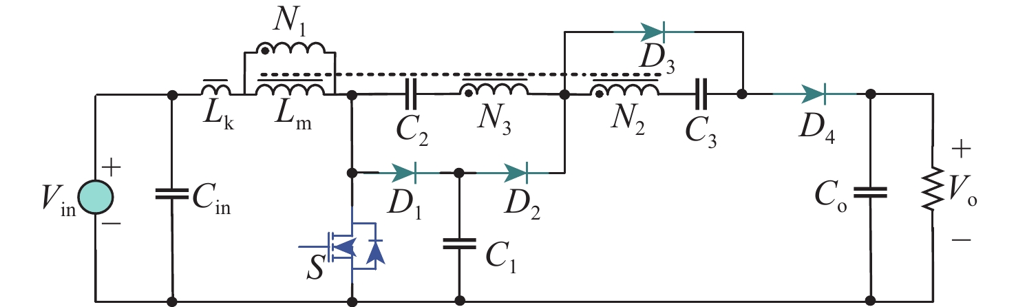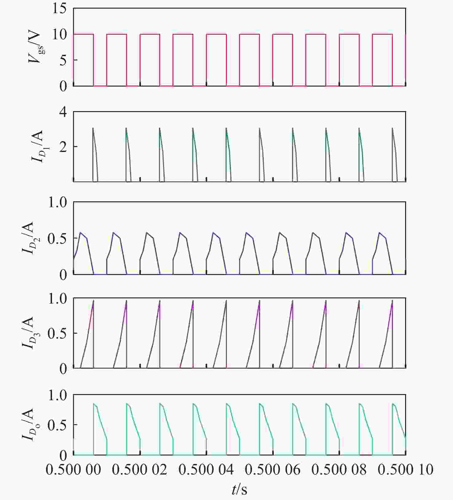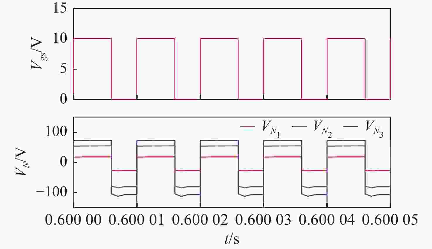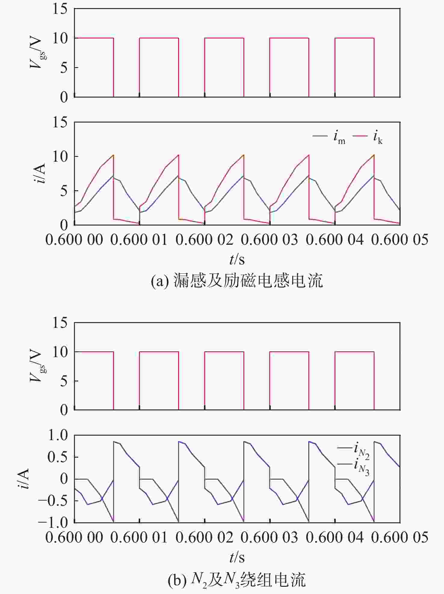 参数 值 漏感Lk/μH 1 励磁电感Lm/μH 18.75 L2自感/μH 168.75 L3自感/μH 168.75 匝比N2:N1 3 匝比N3:N1 3 箝位电容C1/μF 60 电荷泵电容C2/μF 47 倍压电容C3/μF 47 工作频率f/kHz 80 -