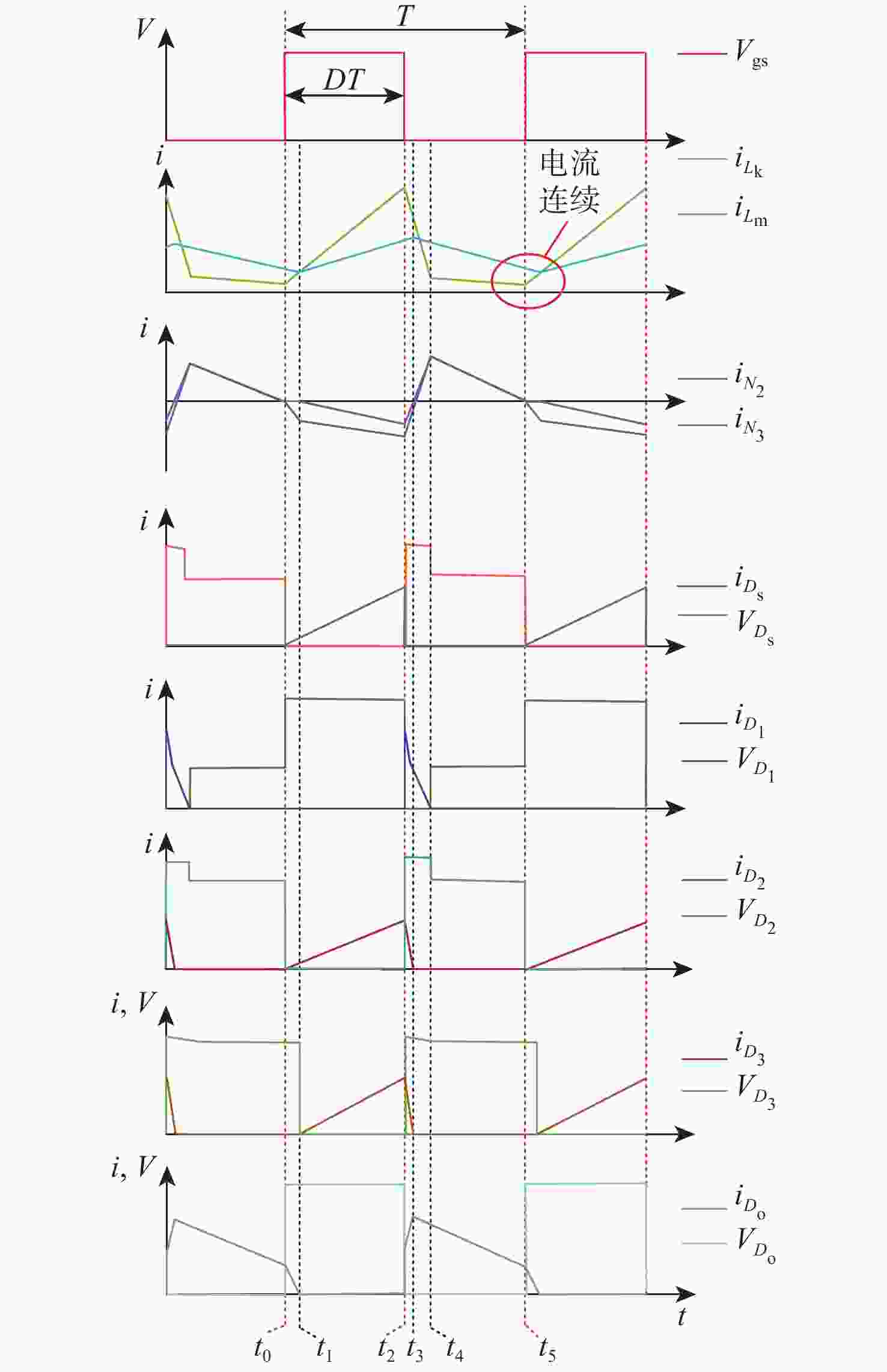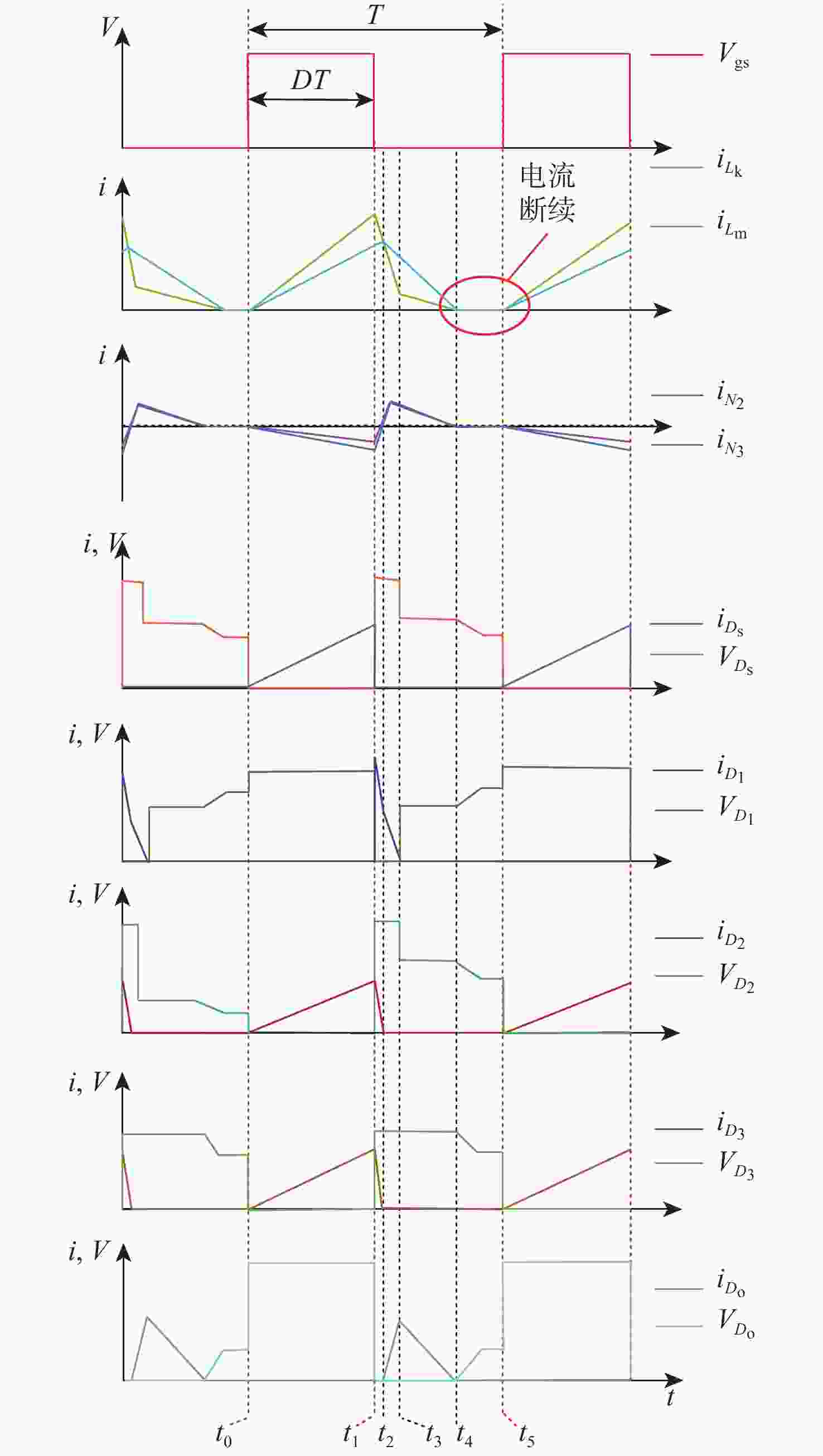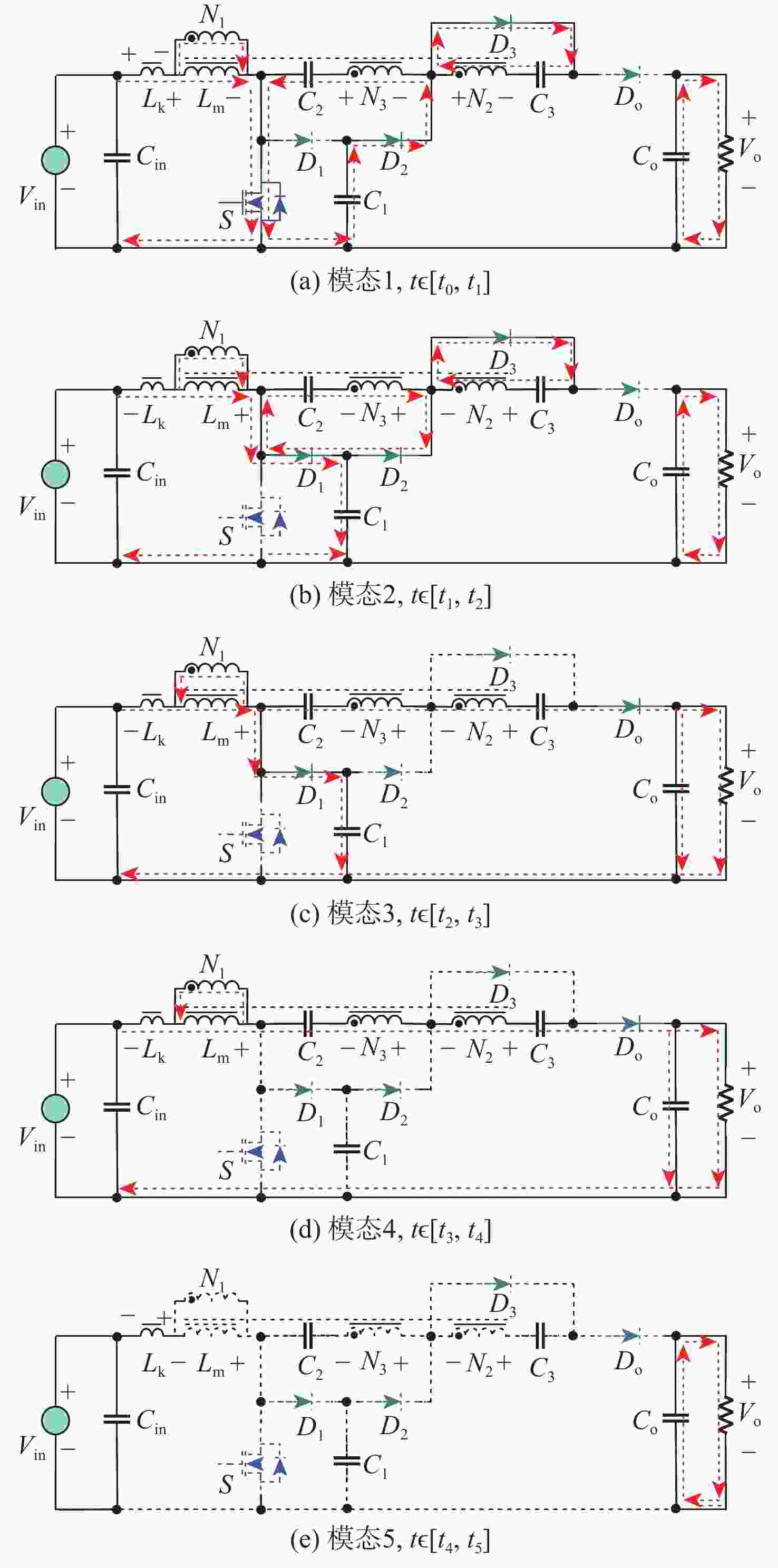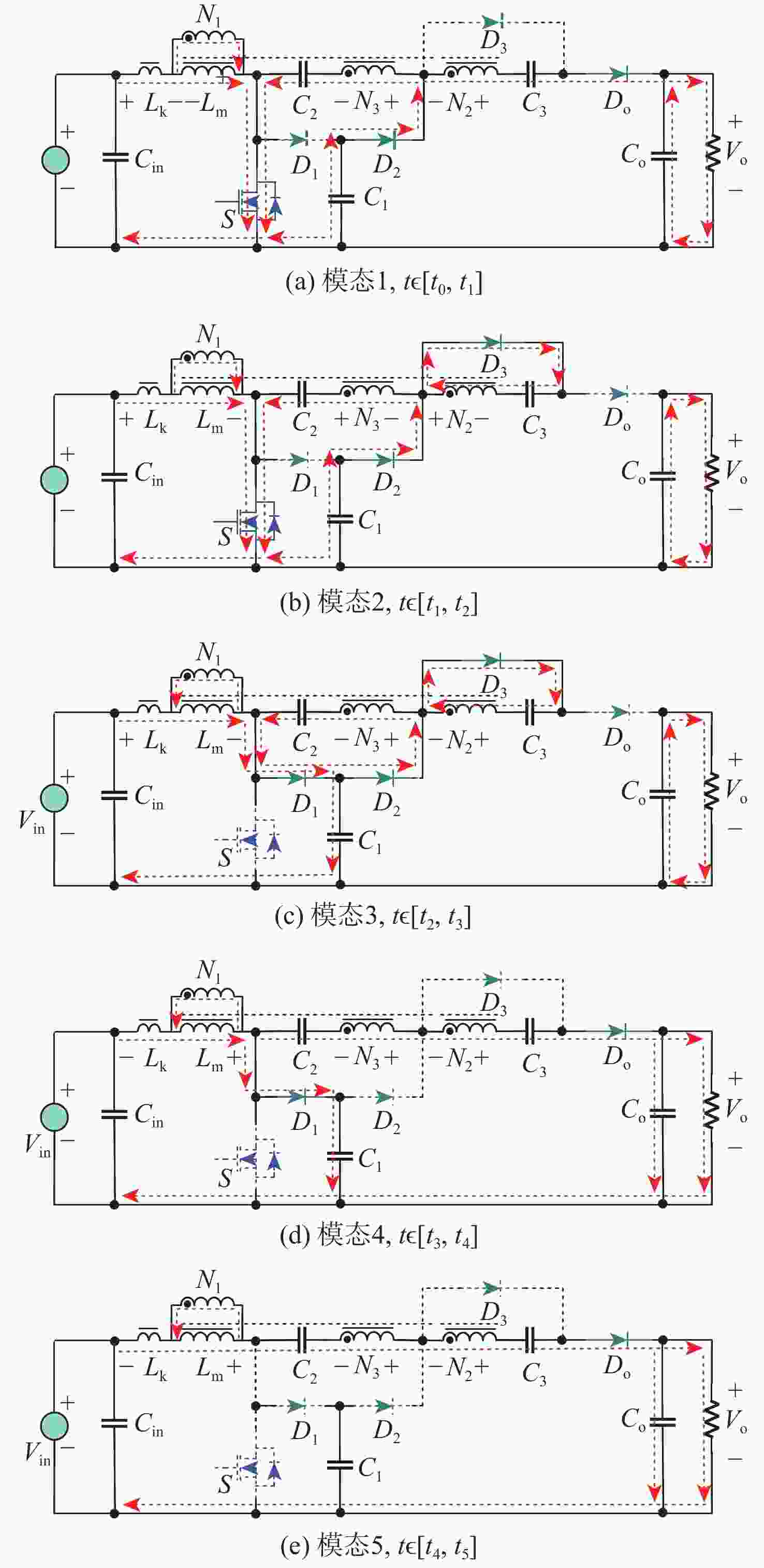 参数 值 漏感Lk/μH 1 励磁电感Lm/μH 18.75 L2自感/μH 168.75 L3自感/μH 168.75 匝比N2:N1 3 匝比N3:N1 3 箝位电容C1/μF 60 电荷泵电容C2/μF 47 倍压电容C3/μF 47 工作频率f/kHz 80 -