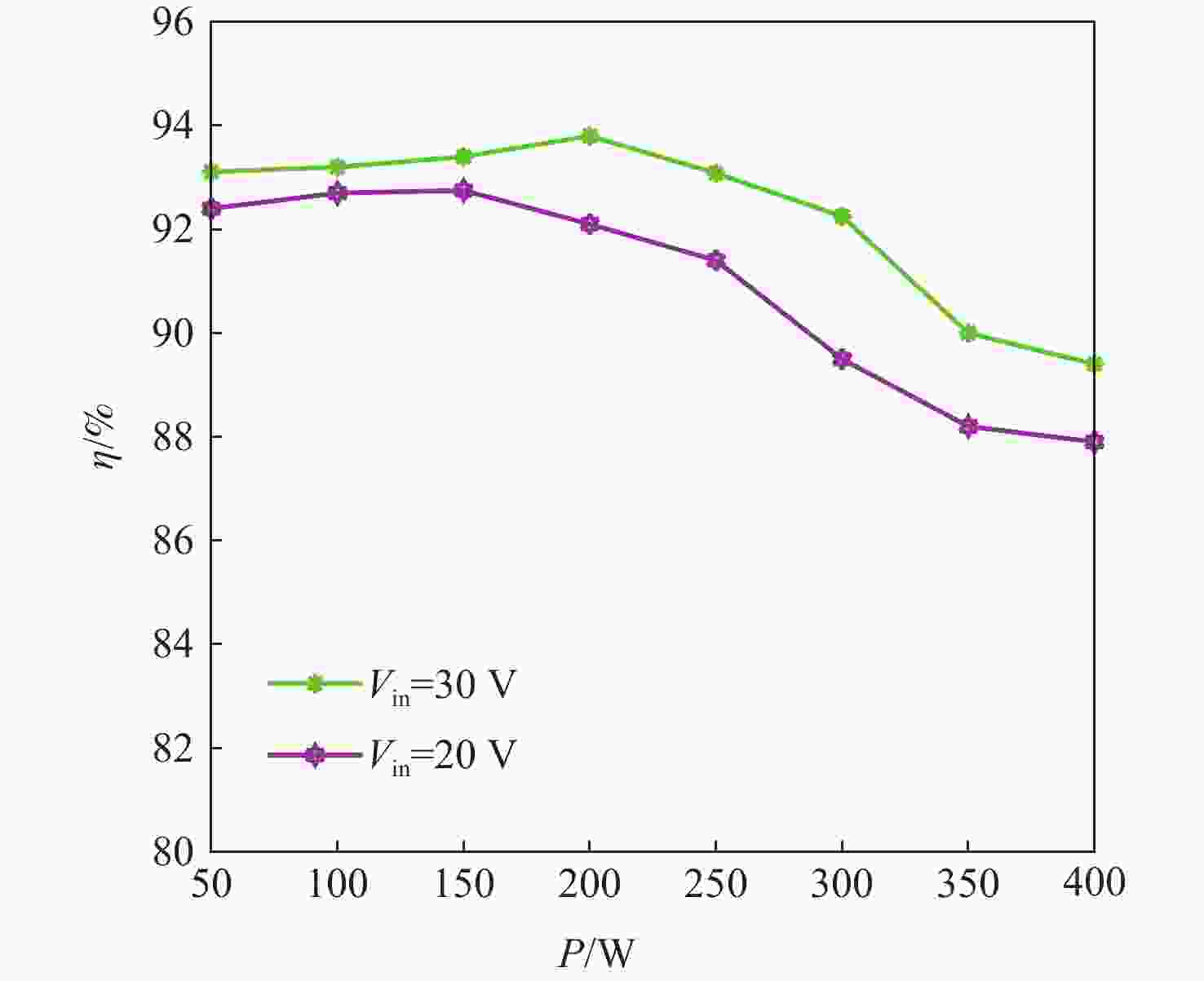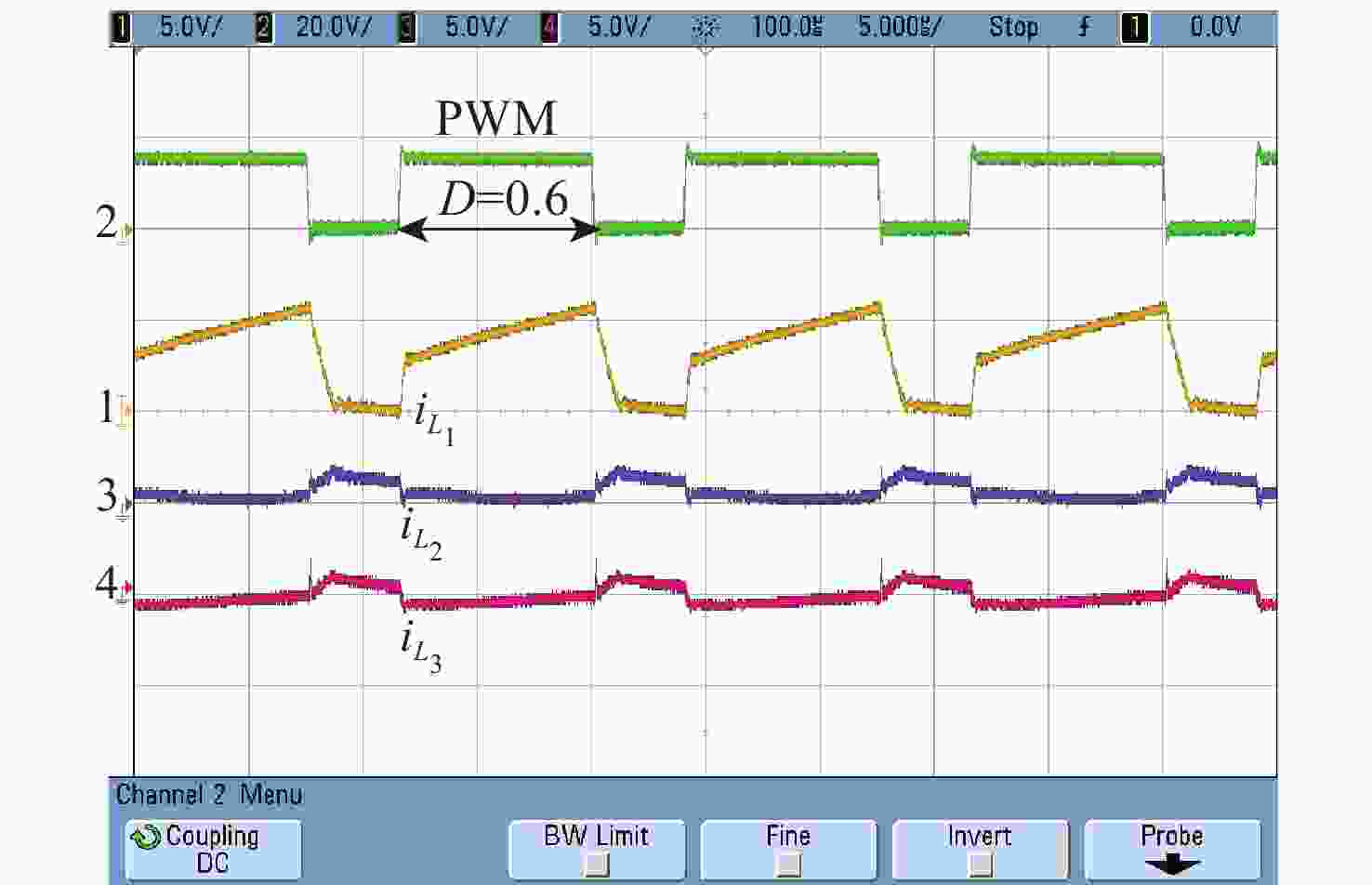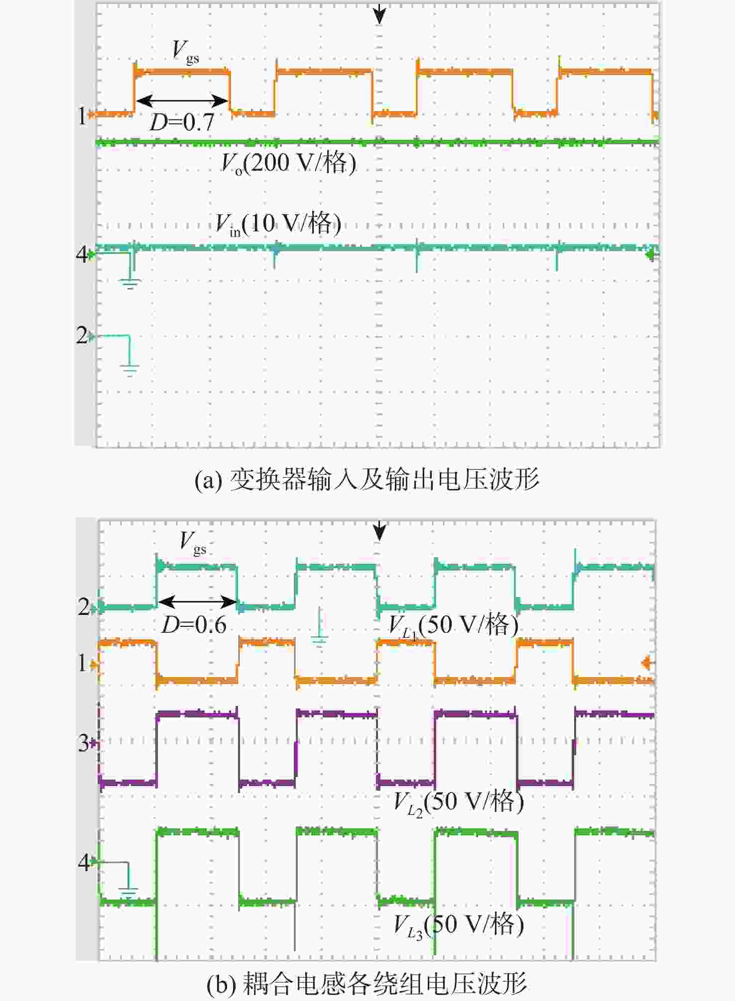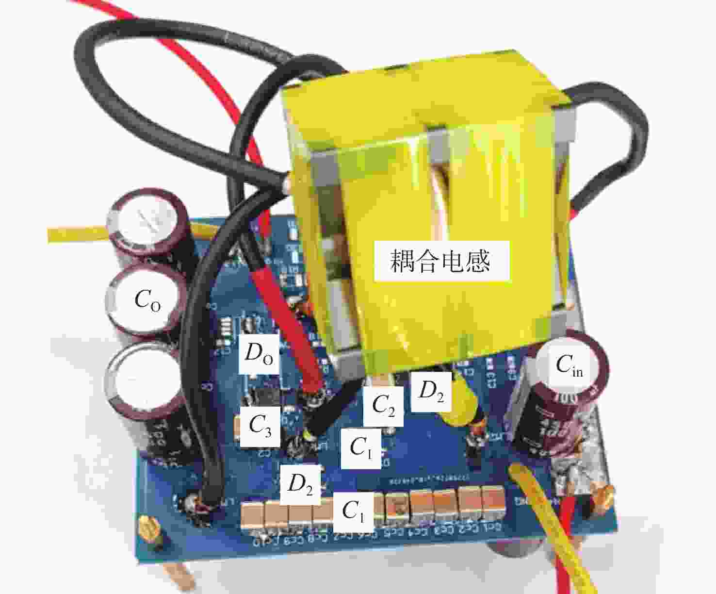 参数 值 输入电压Vin/V 20 漏感Lk/μH 1 励磁电感Lm/μH 18.75 L2自感/μH 168.75 L3自感/μH 300 匝比N2:N1 3 匝比N3:N1 4 箝位电容C1/μF 150 电荷泵电容C2/μF 22 倍压电容C3/μF 47 工作频率f/kHz 100 负载电阻R/Ω 2200 表 2 本文三绕组耦合电感变换器实际样机器件参数