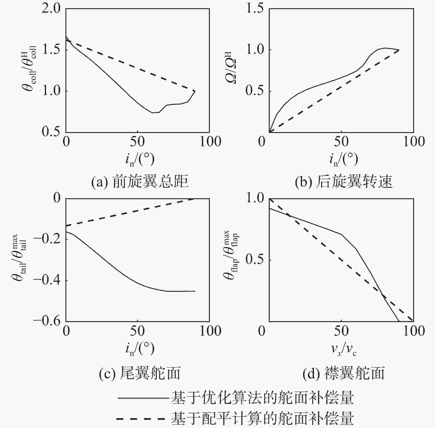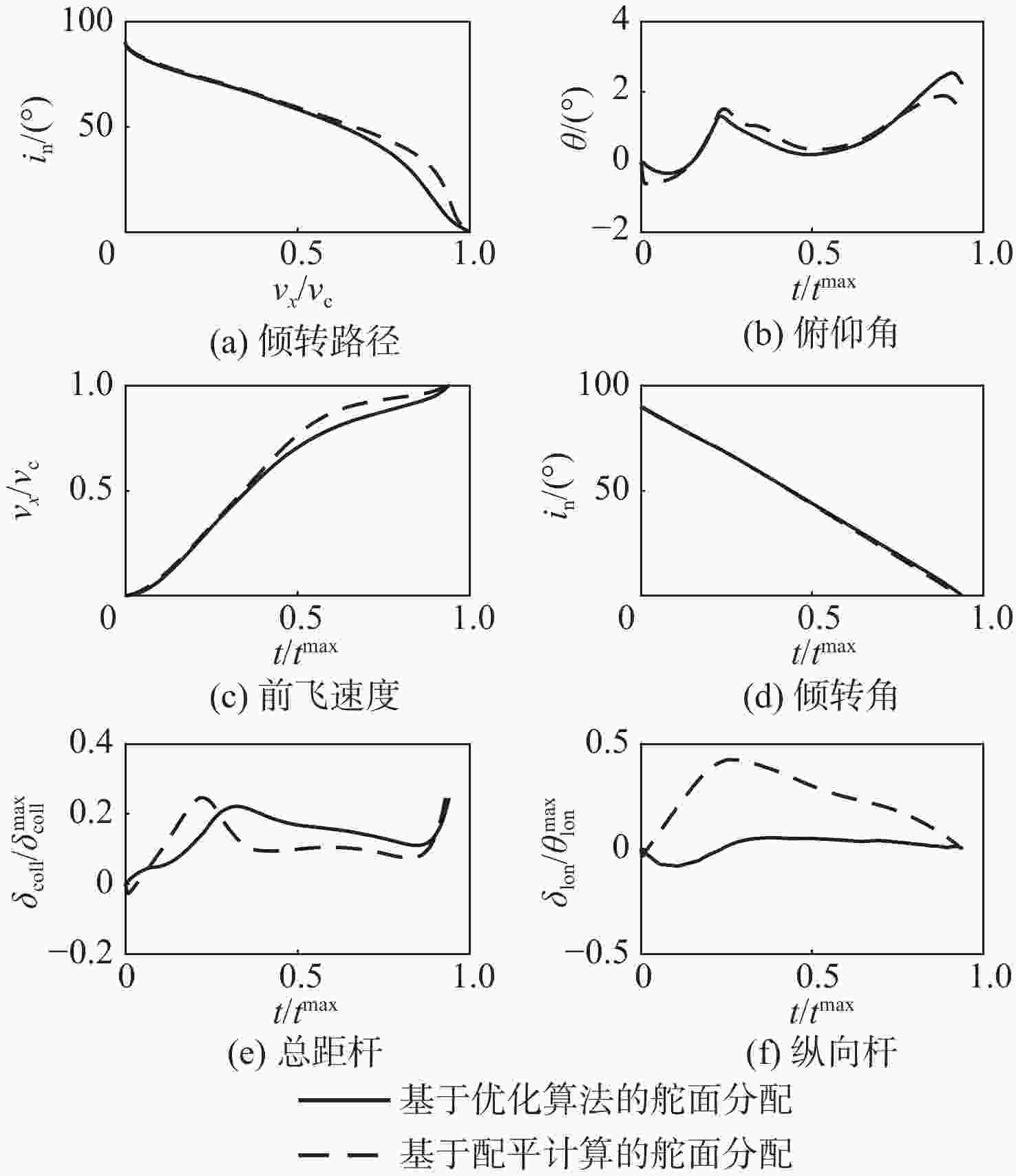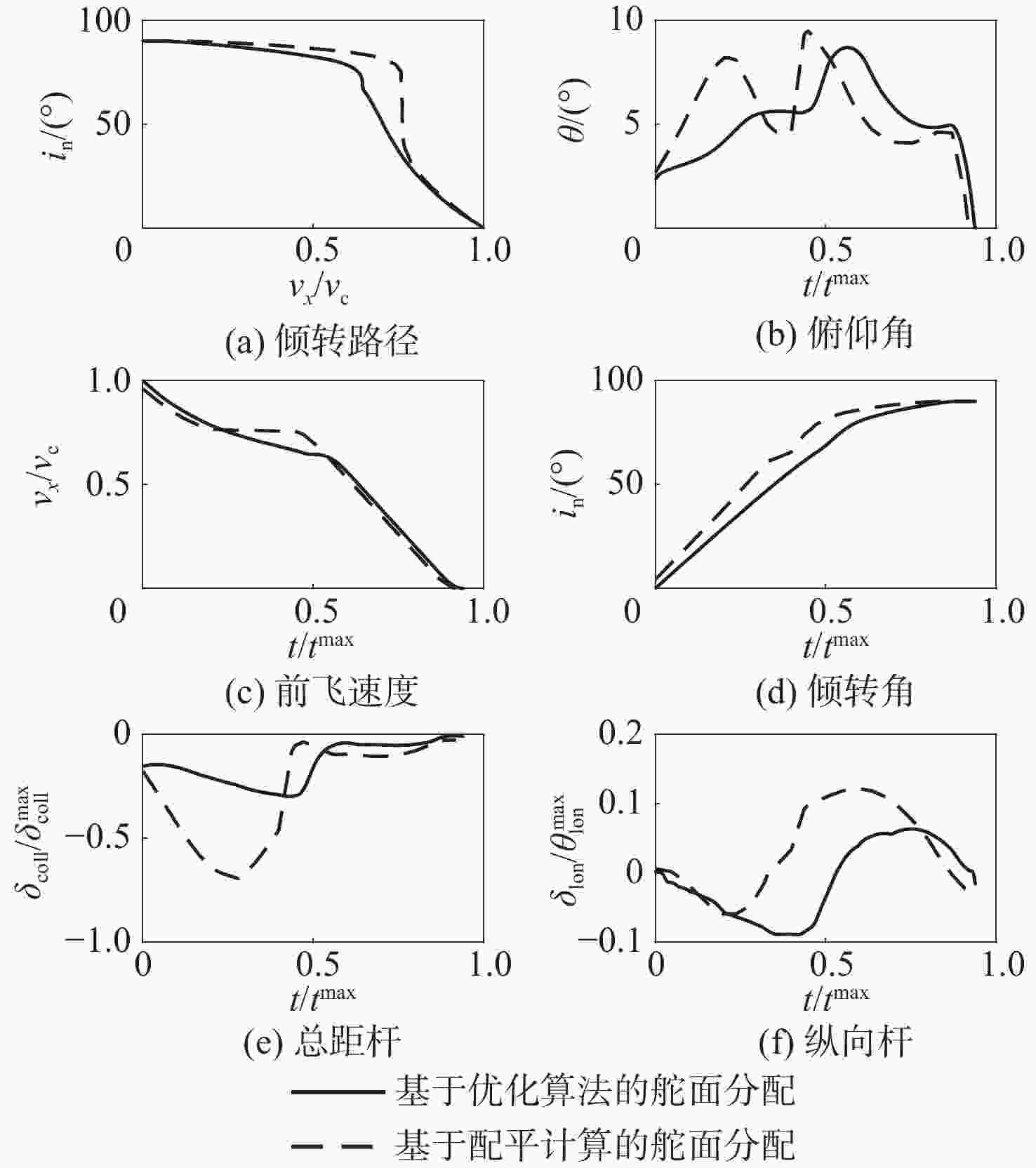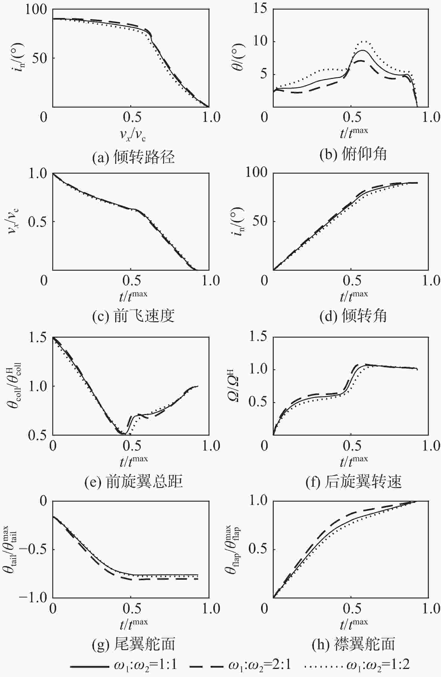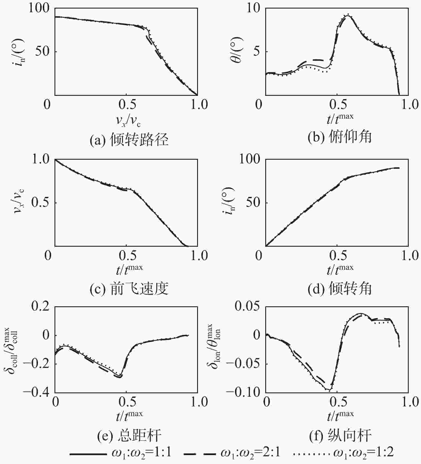 $ {\omega }_{1} : {\omega }_{2} $ $ \dfrac{\partial {\theta }_{{\rm{coll}}}}{\partial \delta } : \dfrac{\partial \varOmega }{\partial \delta } : \dfrac{\partial {\theta }_{\rm{tail}}}{\partial \delta } $ 2∶1 $ \theta _{{\rm{coll}}}^{\max } : 1.94 {\varOmega }^{\max } : 0.41 \theta _{\mathrm{tail}}^{\max } $ 1∶1 $ \theta _{{\rm{coll}}}^{\max } : 1.54 {\varOmega }^{\max } : 0.37 \theta _{\mathrm{tail}}^{\max } $ 1∶2 $ \theta _{{\rm{coll}}}^{\max } : 1.31 {\varOmega }^{\max } : 0.33 \theta _{\mathrm{tail}}^{\max } $ 表 4 基于舵面分配的正向过渡不同权重系数优化目标比值