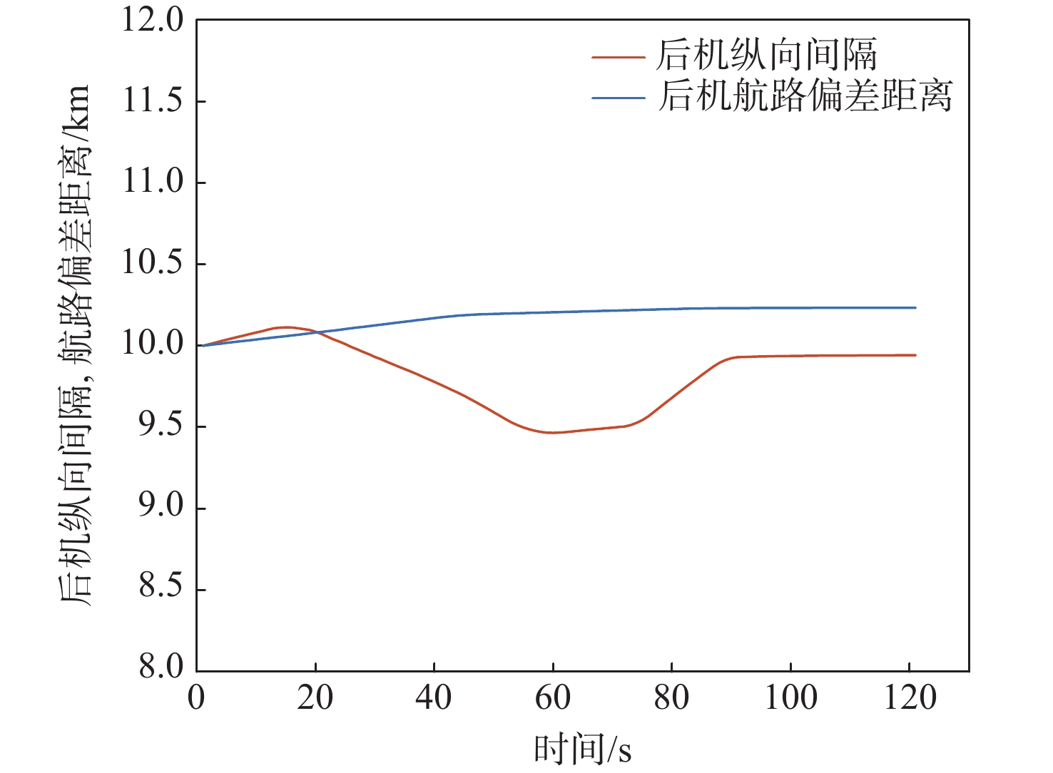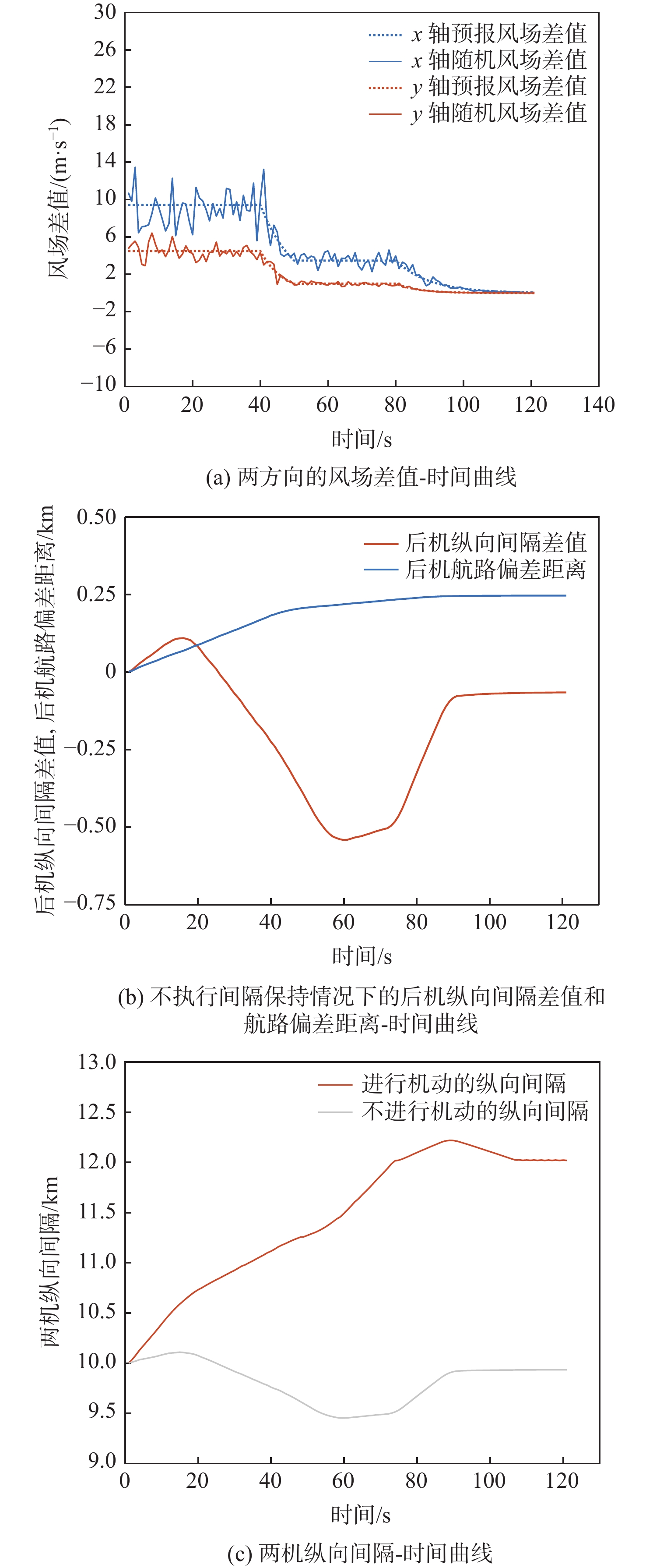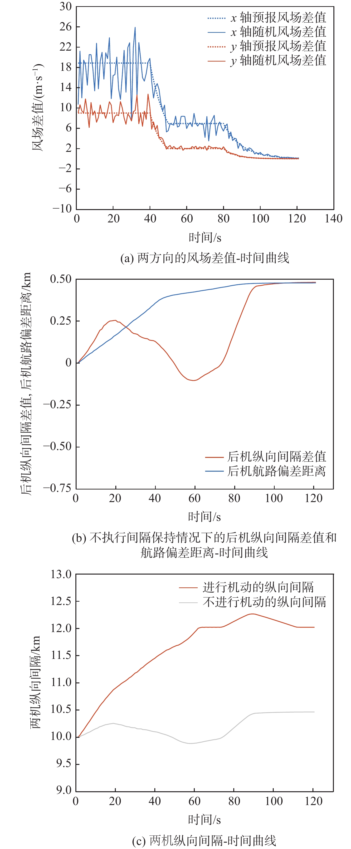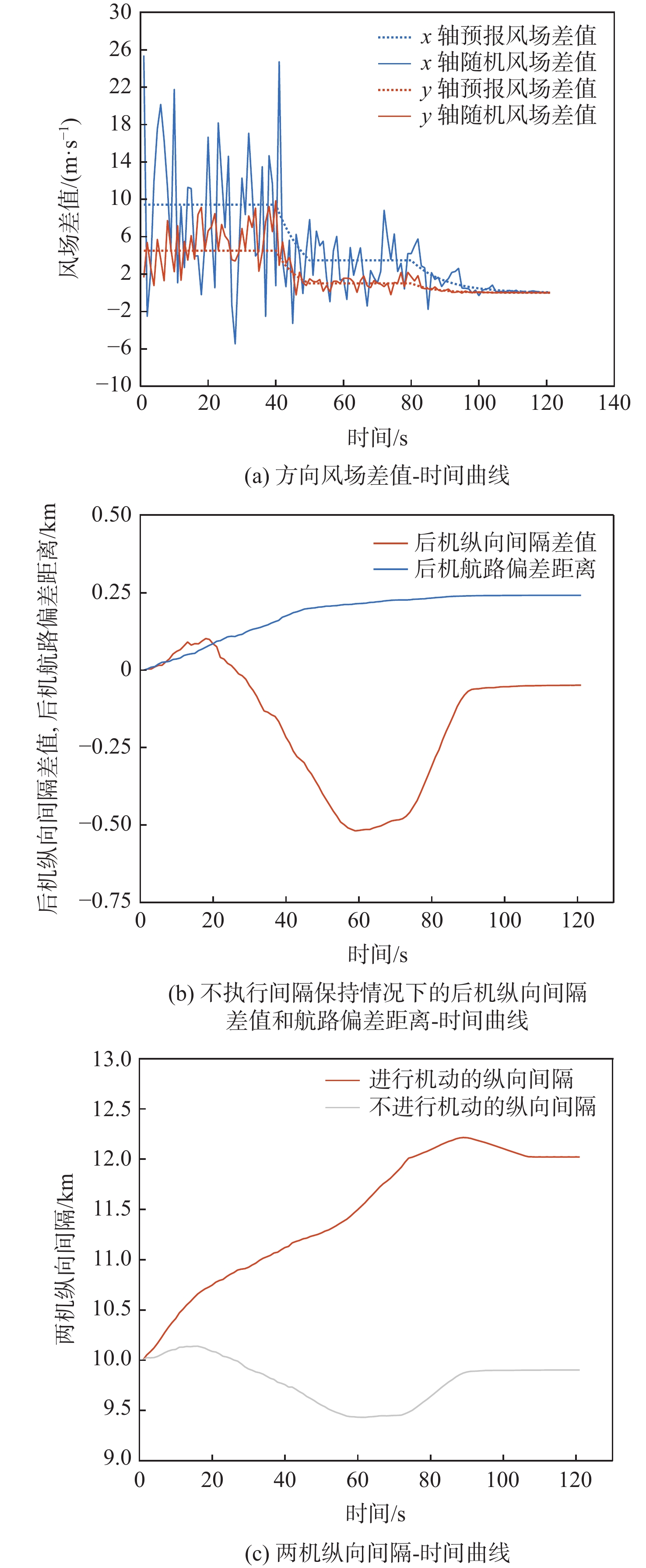In view of the fact that the high altitude wind, a random factor, often leads to poor robustness of the longitudinal separation between two aircraft in the longitudinal autonomous separation maintenance problem under the random disturbance of track, this paper proposed a longitudinal autonomous separation control method based on model predictive control (MPC). Firstly, the linear time-varying prediction model was developed by establishing the nonlinear kinematics differential equation of the longitudinal separation and the wind field difference between the two aircraft. The longitudinal separation and route deviation distance of the two aircraft was selected as the optimization objectives, the vacuum speed and yaw angle of the front aircraft were taken as the measurable disturbances, and the high-altitude wind was the random disturbance. Terminal equality constraints were added to the air safety and aircraft performance constraints to maintain the stability of the system. To verify the effectiveness of the proposed method, within the specified 120-second simulation time, this article set three sets of different expected separations of 12 km, 13 km, and 14 km. Through the design of an MPC controller, the vacuum speed and yaw angle of the following aircraft were controlled during the rolling time domain cycle. The separation curve between the two aircraft is relatively smooth and always not less than the minimum safety separation of 10 km. It stabilized at the expected target separation in the 74th second, 90th second, and 118th second, and returned to the route starting from the 58th second, 74th second, and 95th second. Two sets of wind field control groups were set up. Two times as much wind was forecast in one group, while eight times as much turbulent wind was disturbed in the other. Both groups were able to establish the expected interval of 12 km smoothly and stably in the 61th second and 72th second, respectively.