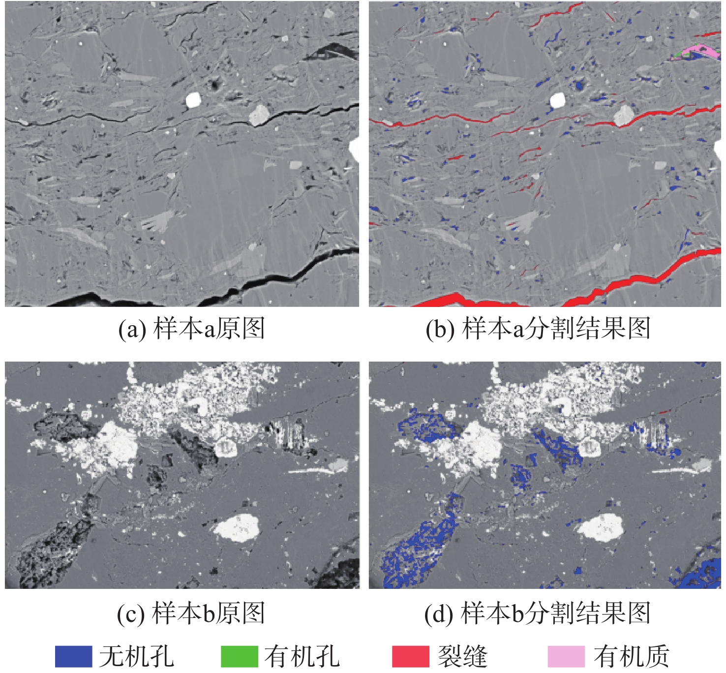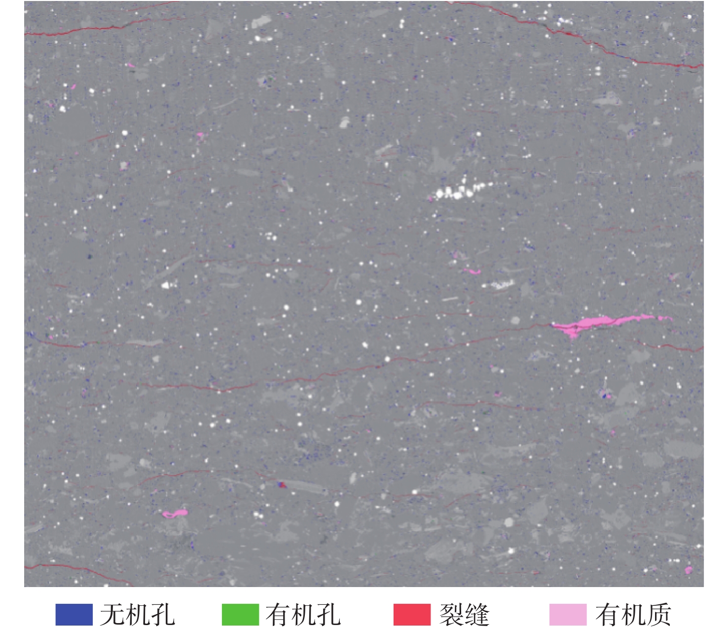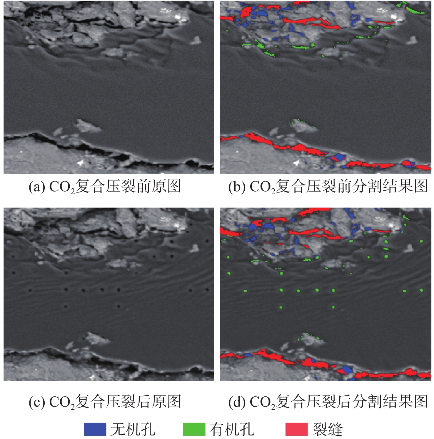 The enrichment and migration of reservoir fluids are affected by the types and structural parameters of shale pores, which are significant components of shale reservoir evaluation. Due to issues with current assessment methods, including high subjectivity, low efficiency, and low degree of quantification, it is challenging to address the urgent needs of quick and accurate examination of shale samples. Based on this, an intelligent characterization method for shale pore structure based on semantic segmentation is proposed. Firstly, the two-dimensional gray images of shale are obtained by scanning electron microscopy (SEM) and multi-scale acquisition and processing software (MAPS). Secondly, these images are annotated by the rock mineral identification experts, and divided into organic pores, inorganic pores, fractures and organic matter. Then, a combination network Shale Seger and its training paradigm for shale pore structure analysis tasks is innovatively proposed, an intelligent recognition model of shale pores based on deep learning is constructed, as well as, a pore recognition scheme of super large image based on multi-view mosaicisis established to extract pore from MAPS images. Lastly, intelligent characterisation of pore structural features is achieved by applying image processing techniques. As of right now, this study has produced a quantitative analysis of the Gulong shale's pore structure that can statistically compute pore structure parameters like pore diameter, apparent pore ratio surface, shape factor, and so forth, as well as automatically determine the area proportion of each type of pore based on pore edge extraction and type recognition. In addition, the technique described in this article can also be extended to the evaluation of CO2 composite fracturing, through which the change of microstructure characteristics before and after CO2 composite fracturing can be quantitatively compared.