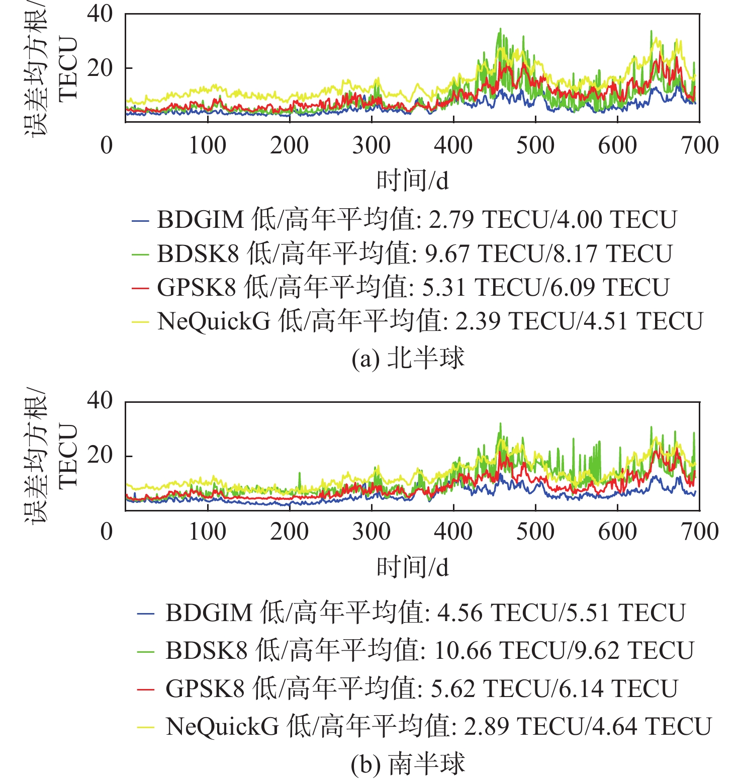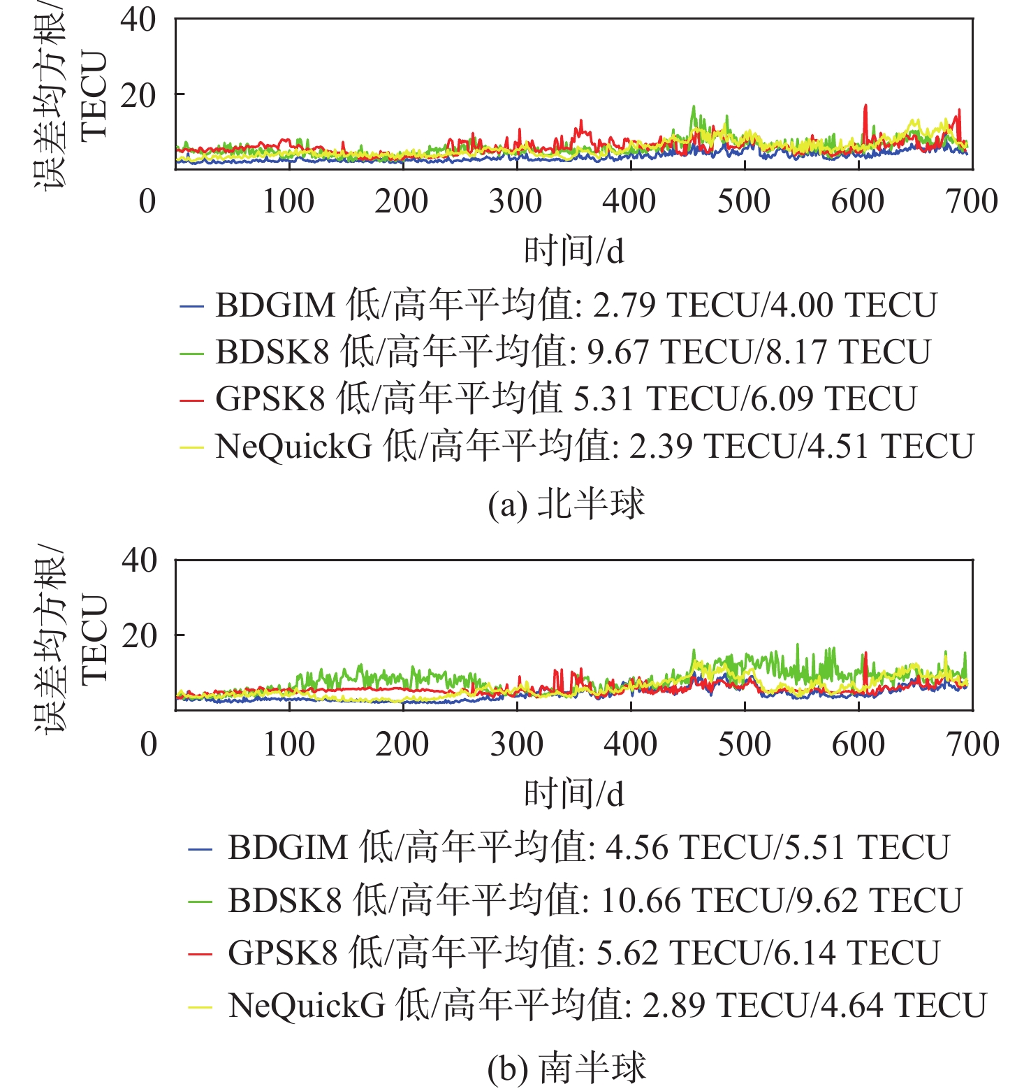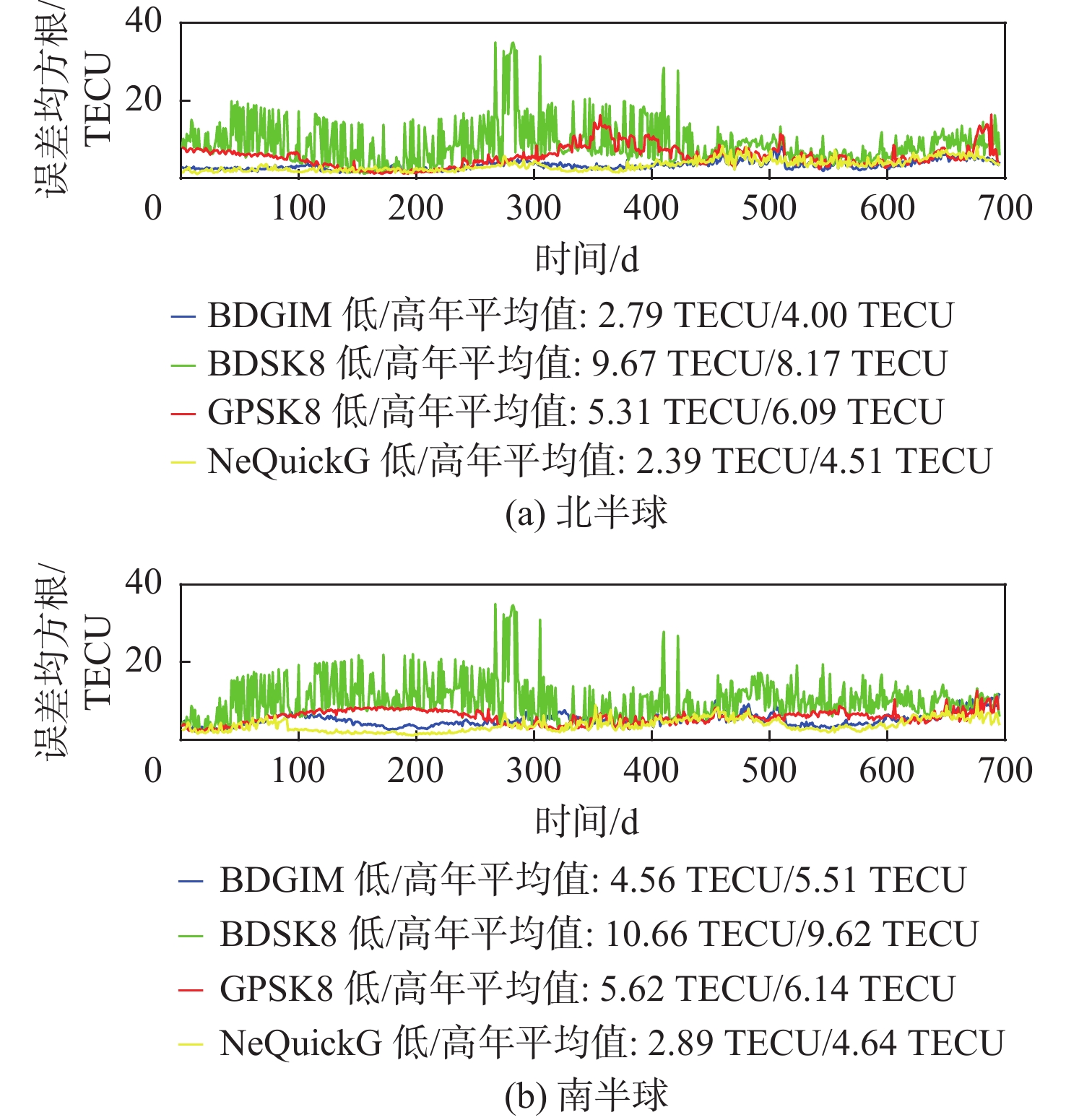 To evaluate the performance of broadcast ionospheric models in existing global navigation satellite systems (GNSS), post-processed global ionospheric map (GIM) products provided by the International GNSS Service (IGS) Analysis Center are used. Long-term accuracy evaluations of ionospheric total electron content (TEC) and positioning domains are conducted for the BeiDou system, global positioning system (GPS), and Galileo broadcast ionospheric models. It is observed that during the solar activity ramp-up, the accuracy of all four models (BeiDou system Klobuchar 8-parameter model (BDSK8), GPS Klobuchar 8-parameter model (GPSK8), BeiDou global ionospheric model (BDGIM), NeQuickG) declines to varying extents, with distinct characteristics observed in different latitude bands. The results indicate that the BDGIM exhibits the best performance, with root mean square (RMS) increasing to 7.27, 4.43, and 4.00 TECU in the three latitude bands, and three-dimensional positioning errors increasing to 6.62, 2.81, and 3.51 meters, respectively. The BDSK8 is most influenced by solar activity, with an RMS amplification factor reaching up to 4 to 5 times. Finally, a Bagging regression tree learner is used to model and predict errors in various broadcast ionospheric models based on space physics parameters. The BDGIM model demonstrates the best predictive performance, with root mean square errors (RMSE) of 2.13, 1.23, and 1.47 TECU for the three latitude bands, and relative errors (RE) of 18%, 15%, and 14%, respectively. The NeQuickG model ranks second, with RMSE values of 4.60, 2.27, and 1.47 TECU, and RE of 17%, 18%, and 21%, respectively. The predictive accuracy of the two Klobuchar models is unsatisfactory.