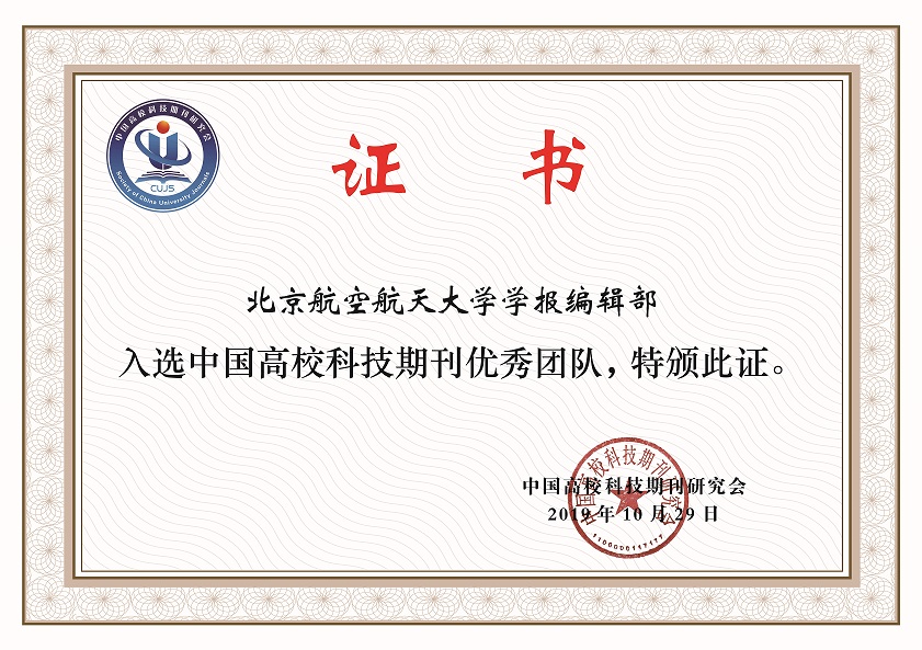 2019年11月6—9日在成都星辰航都国际酒店举行召开的中国高校科技期刊研究会第23次年会上,《北京航空航天大学学报》编辑部获得“中国高校科技期刊优秀团队”称号,全国高校科技期刊共有82家获得此称号。