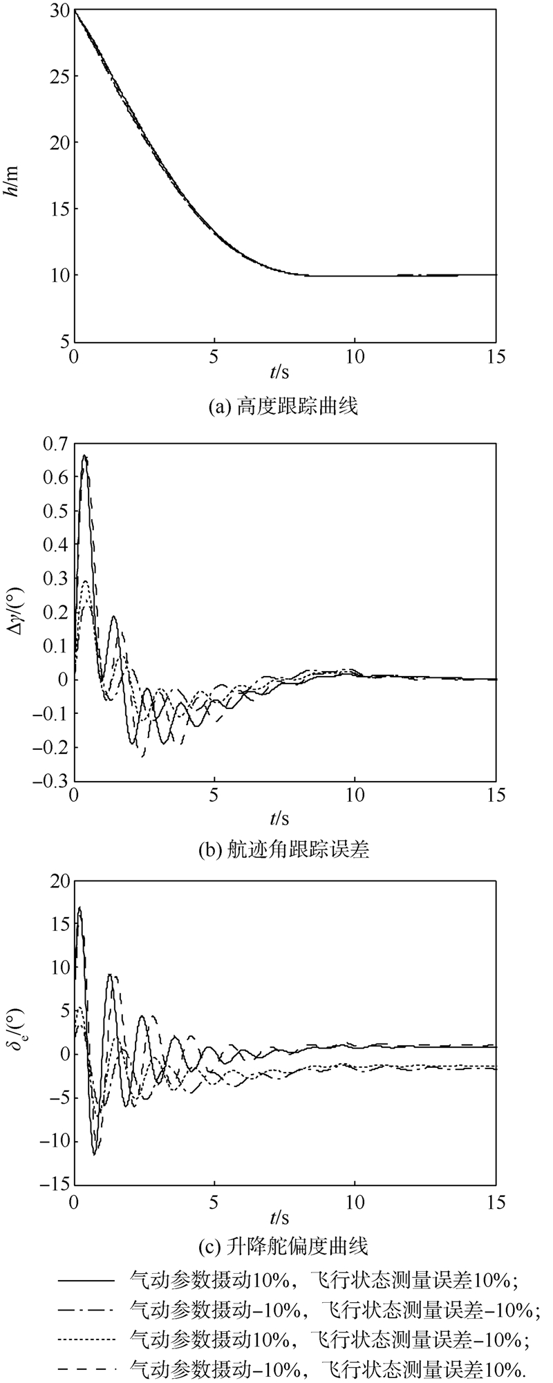 由图 4(a)和图 4(b)可见,当气动参数摄动和状态测量误差时变时,航迹角跟踪误差限制在小邻域内,控制系统仍表现出良好的动态跟踪性能,保证载机平稳地进入空投牵引区域.图 4(c)显示升降舵快速切换,这对舵机性能提出了较高要求.仿真验证了设计的飞控系统对动态模型不确定性和扰动的强鲁棒性能. 6 结 论