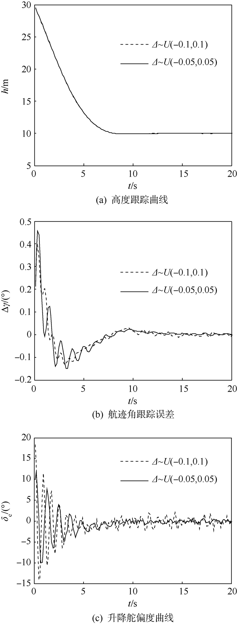 仿真首先验证控制律在气动参数摄动和飞行状态测量不确定性均为常值情况下的跟踪性能.假定由地面效应引起的俯仰力矩系数Cm和升力系数CL摄动±10%.外界大气扰动主要对载机气流角产生干扰,因此,它对载机运动特性的影响可等效为一定程度的飞行状态测量不确定性.假定传感器测量误差和大气扰动使得状态γ,θ,q,δe产生±10%的不确定性.则不确定函数为