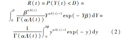 使用Gamma过程{Y(t),t≥0}对产品退化过程建模,则Y(t)首次到达失效阈值D的时间为产品的寿命ξ=inf{tY(t)≥D}={tY(t)≥D}.根据Gamma分布的可加性,由式(1)可得Y(t)~Ga(αΛ(t),β),进而推导出产品的可靠度函数为