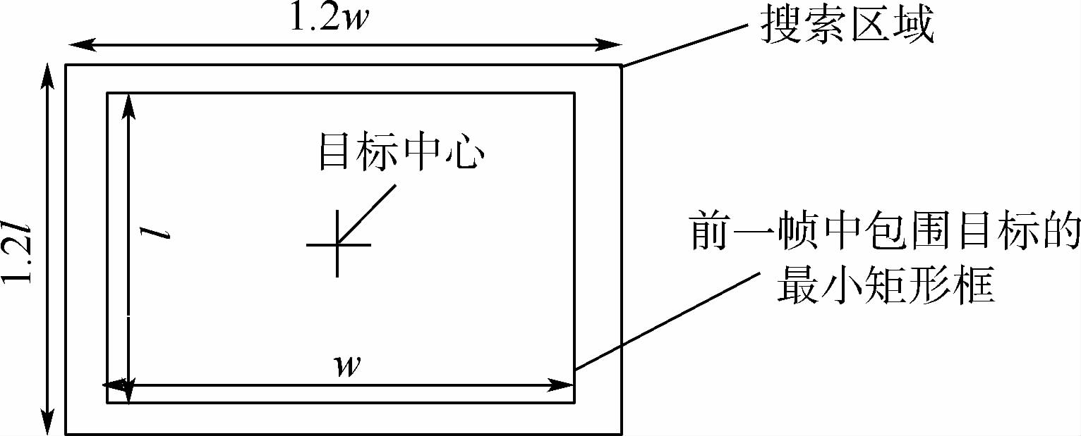 步骤4 在特定的搜索区域内找出其中的最大连通域.假设上一帧中目标的长和宽分别为l和w.一般来说,目标在相邻两帧图像中的尺寸变化不超过20%.因此,本文在得到的二值图像中目标位置上选取长和宽分别为1.2l和1.2w的区域作为搜索区域,其示意图如图 5所示.