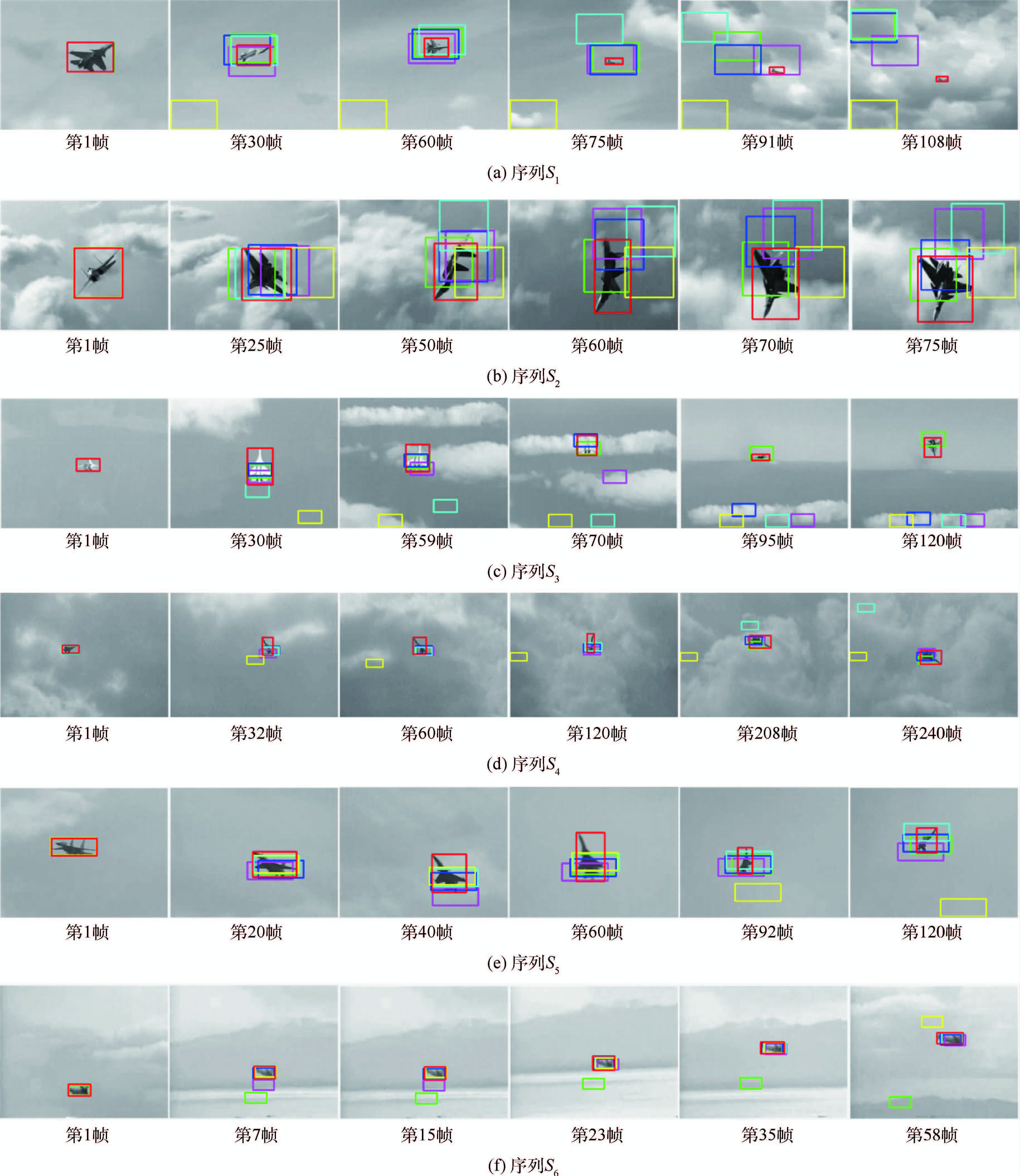 为了验证本文提出算法的有效性和鲁棒性,本文选取了6个包含剧烈变化灰度目标的真实图像序列进行实验.这6个图像序列被依次命名为S1~S6.在这些图像序列中,造成目标剧烈变化的原因包括极快的速度、不规律的运动轨迹、发生翻滚和大幅度的旋转等.本文将提出的算法应用到这些图像序列上进行跟踪实验,并与5个最先进的跟踪算法进行了系统地对比.这5个跟踪算法是分布域跟踪算法(DFT)[26]、最低软阈值平方跟踪算法(LSST)[27]、压缩跟踪算法(CT)[28, 29]、多任务稀疏学习跟踪算法(MTT)[30]以及结合了Kalman滤波器的Mean Shift跟踪算法(KMS).本文算法与5个对比算法定性比较的结果如图 6所示,定量比较结果如表 1和图 7所示.