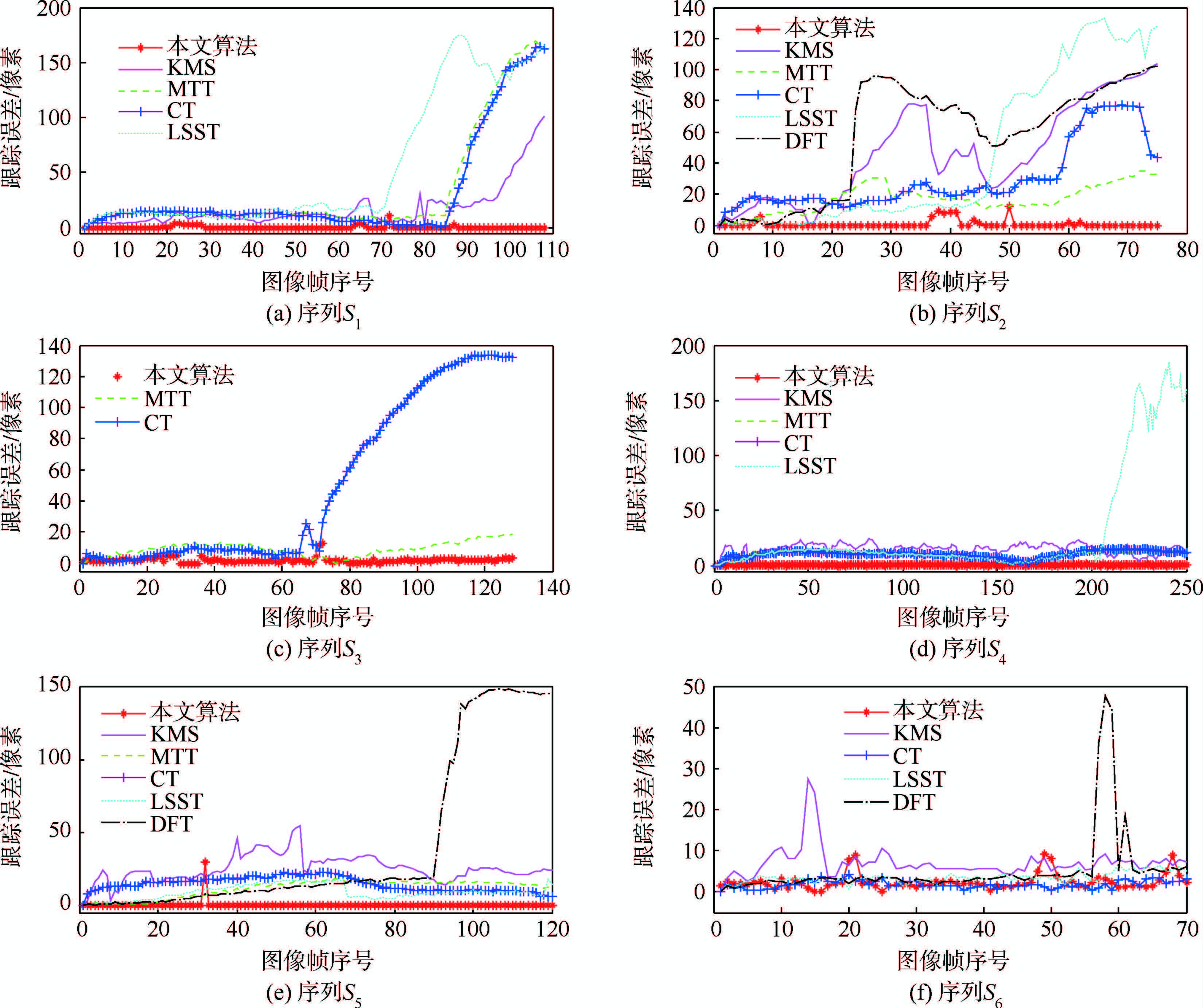 | 图 7 本文算法与KMS、MTT、CT、LSST和DFT的跟踪误差比较 Fig. 7 Tracking error comparison of proposed algorithm with KMS,MTT,CT,LSST and DFT |