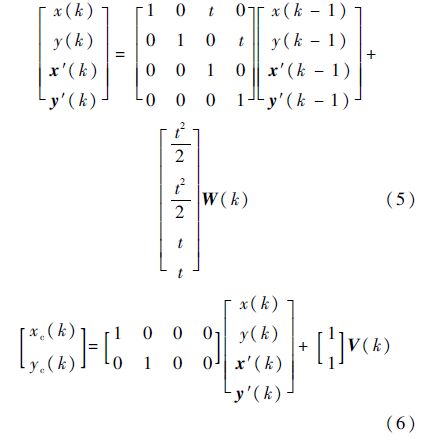 对于第k帧图像,Kalman滤波器的状态向量选取为X(k)=[x(k) y(k) x′(k) y′(k)]T,其中x(k)和y(k)分别表示目标中心的水平向坐标和垂直向坐标;x′(k)和y′(k)则分别表示目标中心在水平向和垂直向上的速度分量.观测向量为Y(k)=[xc(k) yc(k)]T,其中xc(k)和yc(k)分别表示目标中心在水平向和垂直向上的观测值. 则Kalman滤波器可以由式(5)和式(6)表示[24]: