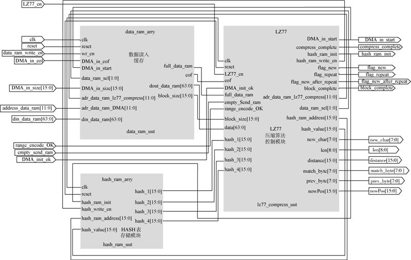 如图 3所示,LZ77压缩控制器包括:数据读入缓存、Hash表存储模块和LZ77压缩算法控制模块.