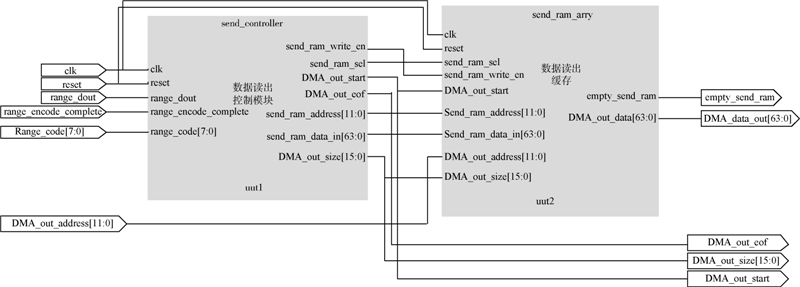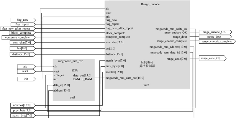 在LZ77压缩控制器输出压缩的编码后由区间编码控制器进一步对数据流进行二次压缩[11],如图 5所示为区间编码控制器的结构图,其中区间编码算法控制模块用于进一步的压缩和编码,RANGE_RAM模块则是用于存储相关的编码概率信息,关于RANGE_RAM区间分配如表 2所示.