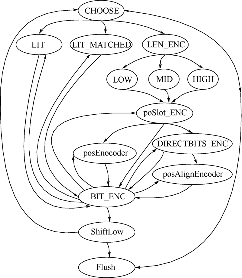 4) LEN_ENC:对重复长度LEN进行压缩编码.首先针对isMatch和isRep进行编码,进一步地根据LEN值选择choice1或choice2进行编码,并且同时确定采用LOW,MID和HIGH中的一种编码,编码完成后跳转到posSlot_ENC状态下.
