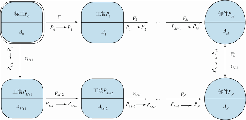 不失一般地,设交点部件PM和PN具有图 1所示的制造协调路线.其中,标工P0是原始协调依据,部件PM的交点依次经工装P1、P2、…、PM-1“移形”制造,部件PN的交点由工装PM+1、PM+2、…、PN-1“移形”制造,称相邻制造单元的尺寸形状传递为移形环节.例如,移形环节“P0→P1”表示由标工的P0交点移制工装P1的交点,具有交点装配协调要求的部件PM和部件PN协调环节用“PMPN”表示.Δi和∇i(i=1,2,…,N)分别表示制造单元和移形环节的误差.若∇N+1表示协调环节的交点装配误差,则由于误差累积导致的交点部件协调误差为