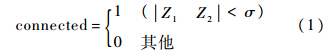 本文在二维空间区域连通的基础上采用深度相机增加判定条件式(1),变量connected的值代表相邻点是否连通,若相邻两像素的深度距离小于σ,connected=1则认为相邻两像素在三维空间中连通,为0则不连通.由于遮挡目标之间深度距离限制,可有效地避免遮挡目标被视为一体的分割(图 1(b)),有助于后续运动跟踪的鲁棒性.