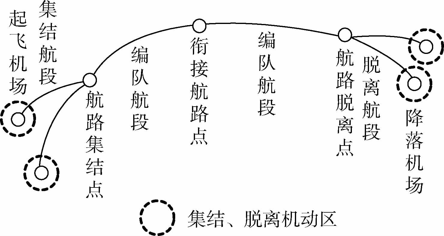 1 问题描述 1.1 编队路径根据Bower的定义[12],编队路径由起飞机场、离场集结点、集结航段、航路集结点、编队航段、航路脱离点、脱离航段、进场脱离点和目的地机场构成,如图 1所示.集结点和脱离点分别为航空器加入和脱离编队的点.对于同一机场起飞和降落的子编队,由于航空器在爬升、下降航段尾涡场不稳定,因而设置集结机动区和脱离机动区,同一机场起降航班子编队在机动区内保持正常间隔飞行;机动区的半径通常在100 n mile范围[12].由于飞行区域可能存在飞行限制区、危险天气、通信导航盲区、备降机场位置约束等,需要增加中间衔接航路点以避开不利约束区域.