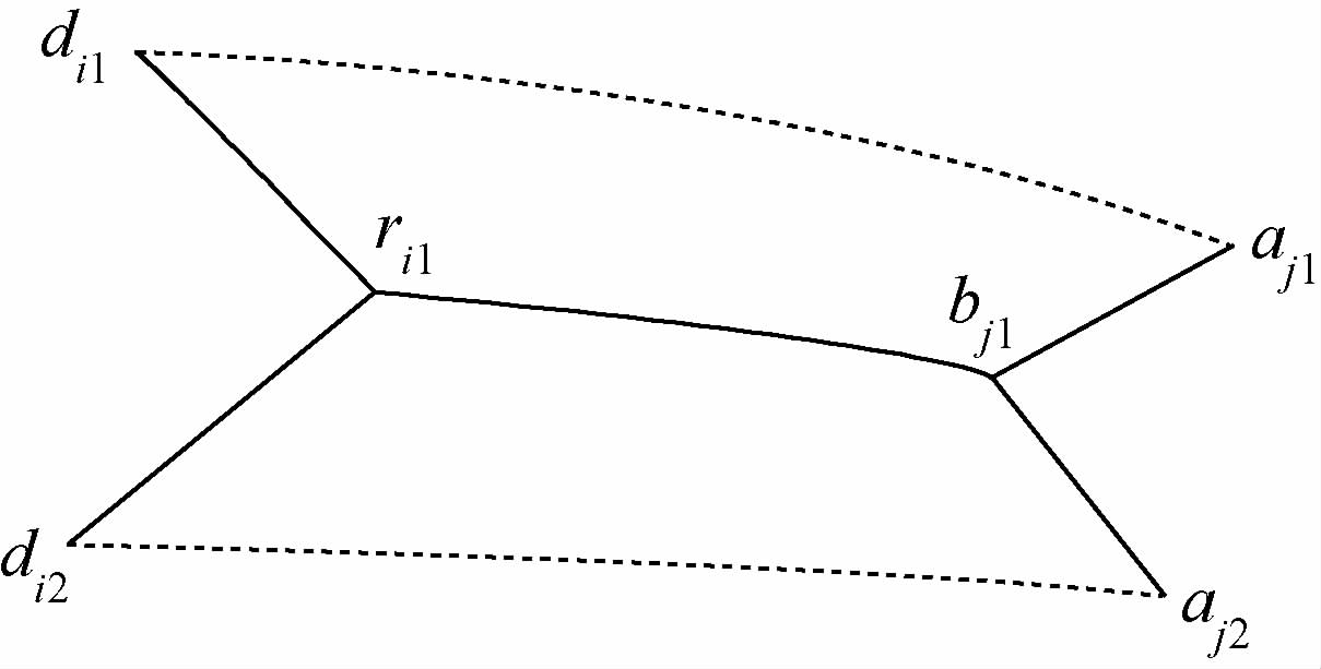 1) 如果D、A非空,按照深度优先规则,基于起降机场对的影响力因子λij,每次从D、A中仅选择λij最大起降机场对(di1,aj1,qi1j1)及与其空间维相似度最高的起降机场对(di2,aj2,qi2j2)构造球面4点的WGSMT.利用WGSMT有限几何简化原则,得到集结点ri1和脱离点bj2,如图 10所示.其中,虚线为当前单独执行任务路径;实线为规划的编队路径.