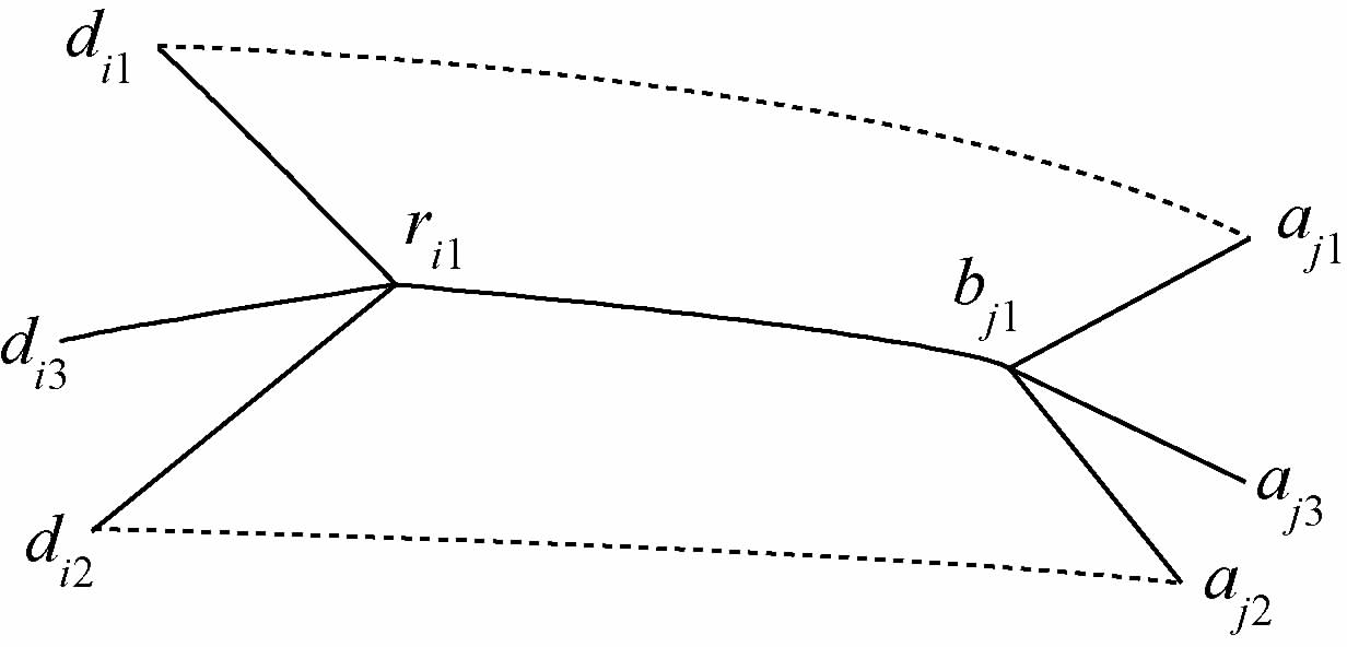 ③ 存在Steiner点的度大于3,如图 11中的ri1和bj1.出现该情况的原因在于递归构造WGSMT树的过程中,利用Steiner点代替其支撑的正则点进行构造.此路径非几何意义上的最优.修复方法:从di1、di2选择与di3空间相似度较高的一点,假定为di2点,构造r′i2=3-Steiner(di2,di3,ri1);同样,从di1、di2选择与di3空间相似度较高的一点,假定为aj3点,构造bj2=3-Steiner(aj2,aj3,bj1),最终得到如图 12所示的满拓WGSMT.