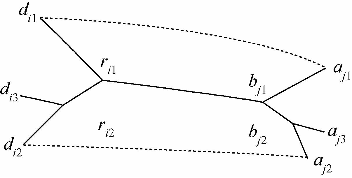 如果ri、bj分别是起飞机场di-1、di和降落机场aj-1、aj的集结点和脱离点,记为