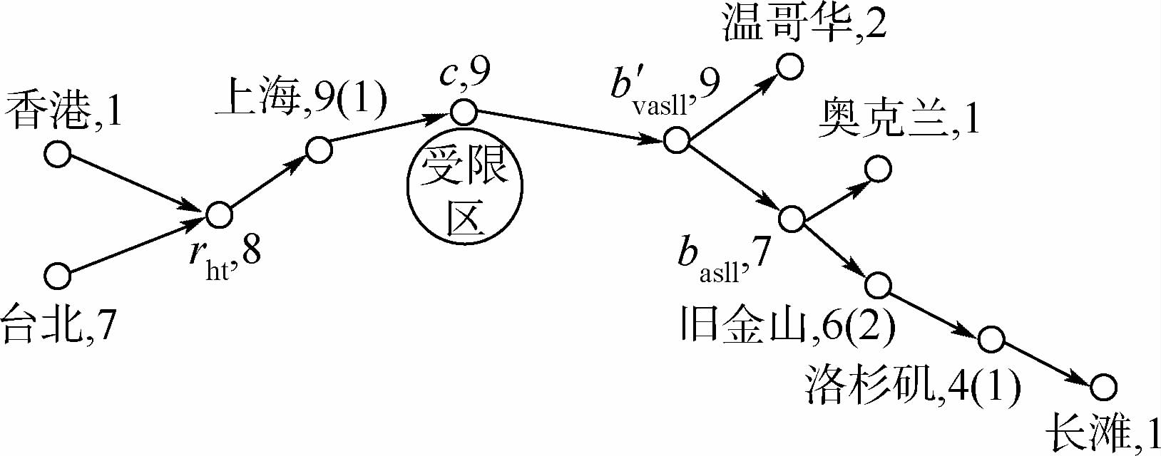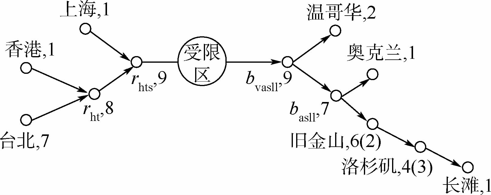 2) WGSMT编队路径有2个满拓的集结点rht和rhts、2个满拓的脱离点bvasll和basll、2个度为2的脱离点“旧金山”和“洛杉矶”;OAWGSMT编队路径有1个满拓的集结点rht,1个度为2的集结点上海,2个满拓的脱离点b′vasll和basll,2个度为2的脱离点“旧金山”和“洛杉矶”,1个衔接点c.两种路径均满足节点度约束和流量平衡约束.