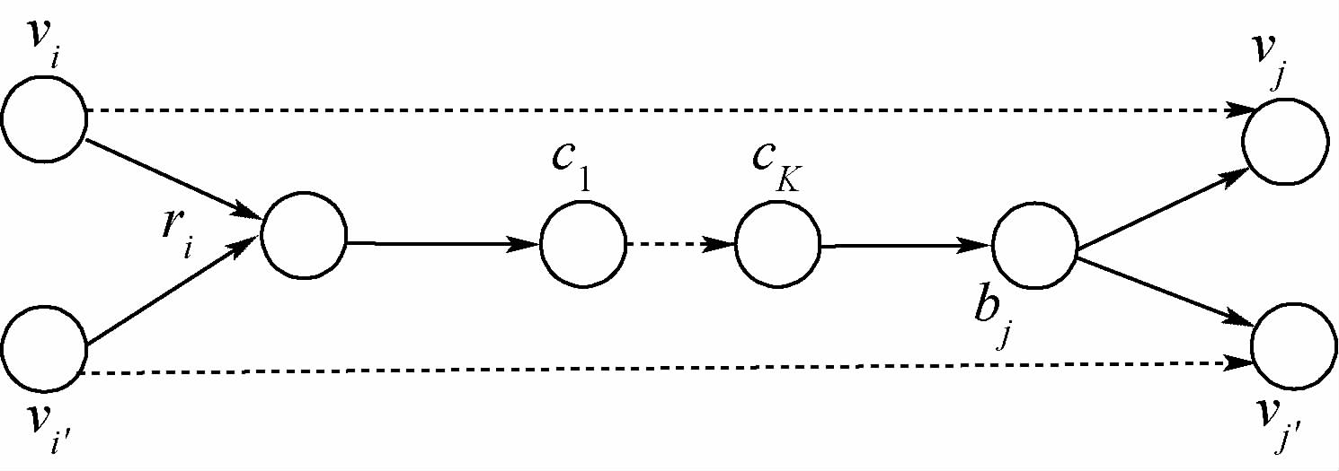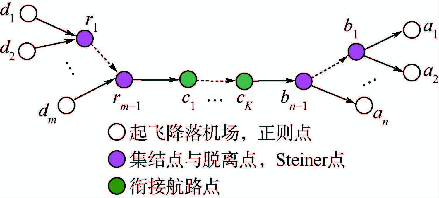 观察图 2,由于规定起降机场对间两两编队,因而集结点的入度为2,出度为1;脱离点的入度为1,出度为2.如果将中间衔接航段视为超边,则图 2所示树状结构即为满拓的Steiner树,其中起降机场为正则点,节点度为1,集结点和脱离点为Steiner点,节点度为3,每一个集结点或脱离点均衔接两个正则点和一个Steiner点.满足上述特征的网络称为Steiner树.本文将编队飞行路径规划问题抽象为WGSMT构造问题:规划支撑起降机场集合的最短加权衔接网络.