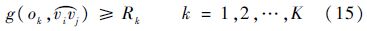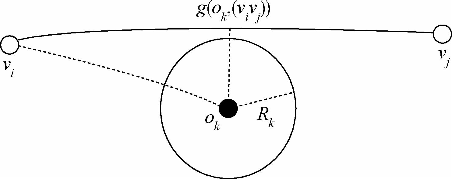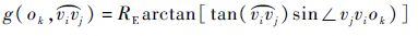 为连接vi与vj大圆劣弧;O={(ok,Rk)|k=1,2,…,K}为障碍物集合,ok为圆心;Rk为受限区半径.由球面三角知识: