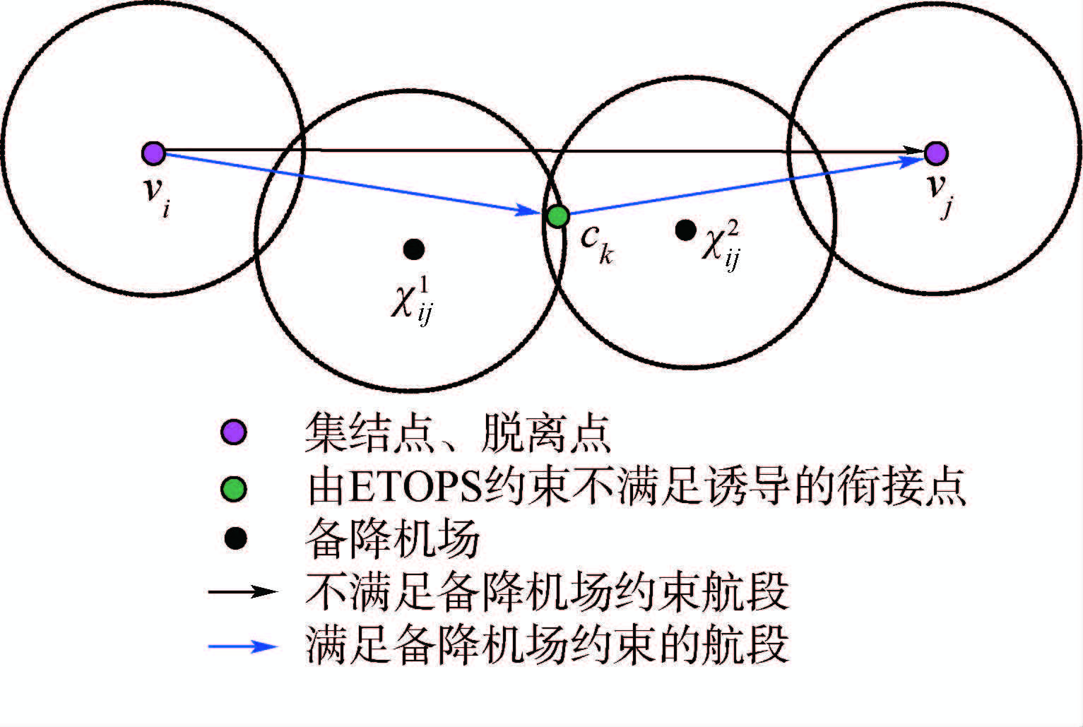 | 图 5 备降机场约束不满足时新增中间衔接航路点ck Fig. 5 A new connection point ck is added whenever ETOPS constraint is not satisfied |