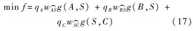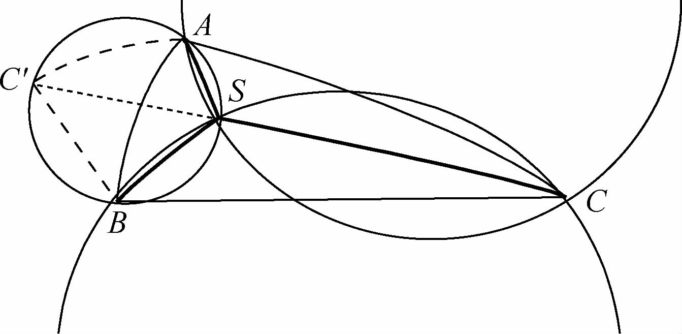 与△ABC′球面外接圆交于异于C′的另外一点S即为球面3点A、B和C满足角度条件式(20)~式(22)的WGSMT Steiner点,如图 6所示.