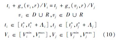 对于任一集结点r∈R,若两个航班子编队i和j到达其前驱节点vi和vj的时刻分别为tia和tja,双方应能在最大允许延误时间窗Λi、Λj内和速度包线[Vimin,Vimax]、[Vjmin,Vmaxj]内选择合适的离开时刻ti、tj和速度Vi、Vj,以确保同时到达集结点r.