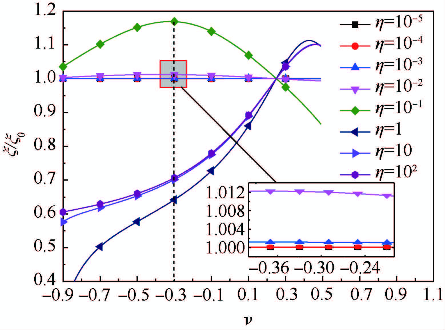 | 图 2 考虑重力影响ξ/ξ0随泊松比ν变化 Fig. 2 Variation of ξ/ξ0 for different gravity parameters with respect to ν |
