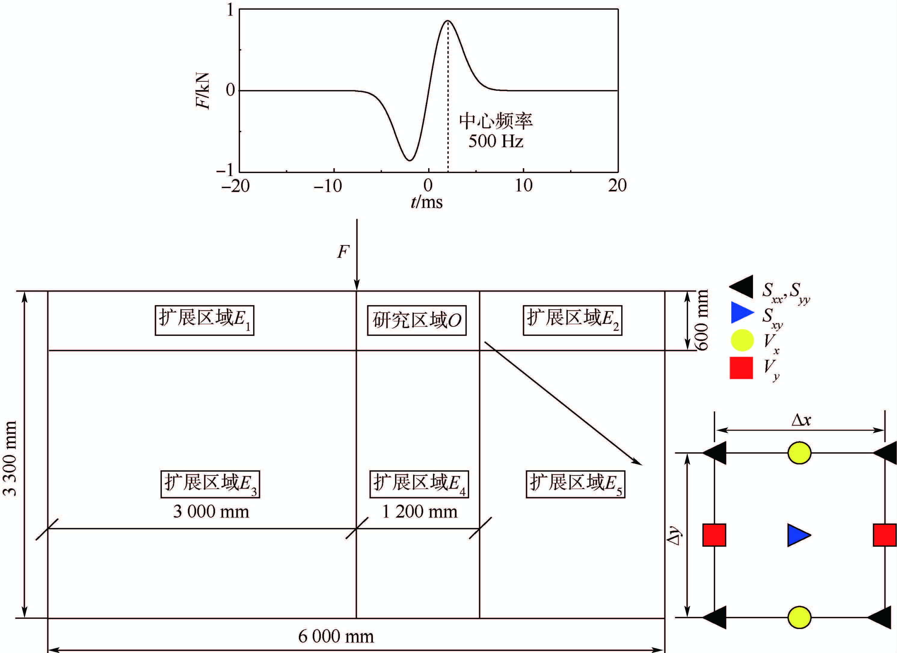 在图 3中计算模型采用交错网格(staggered grid)离散,应用了3套不同的网格系统,即将正应力Sxx和Syy在正常的网格结点上存储和计算,而将速度分量Vx和Vy、剪应力Sxy分别放在两套不同的错位网格上,如图 3所示;该方法可以很好地处理波动方程中速度与应力的耦合关系.图 3中研究区域O为目标计算区域,尺寸为1 200 mm×600 mm,离散方式为
