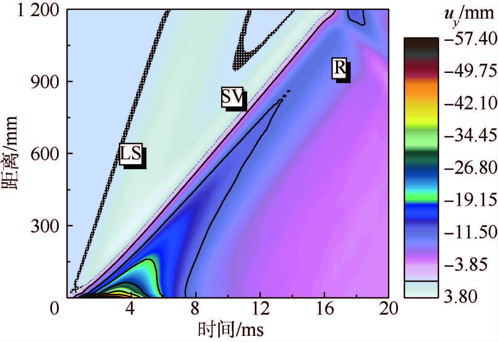 图 4、图 5分别为含重力影响,表面接收点竖直方向位移uy的三维、二维随时间变化云图,图中LS、SV、R分别表示泄露横波(leaky surface wave)、竖向横波、瑞利波.其中各向同性弹性材料中的LS波速的数学含义为瑞利方程的共轭复数根,只有当泊松比ν>0.263时才出现[17].在图 5中可以清晰地看到LS波的传播路径,其斜率即为其波速,约为193.00 m/s,小于纵波波速,大于横波波速,同理,从该图中可以计算得到S波波速为88.69 m/s.