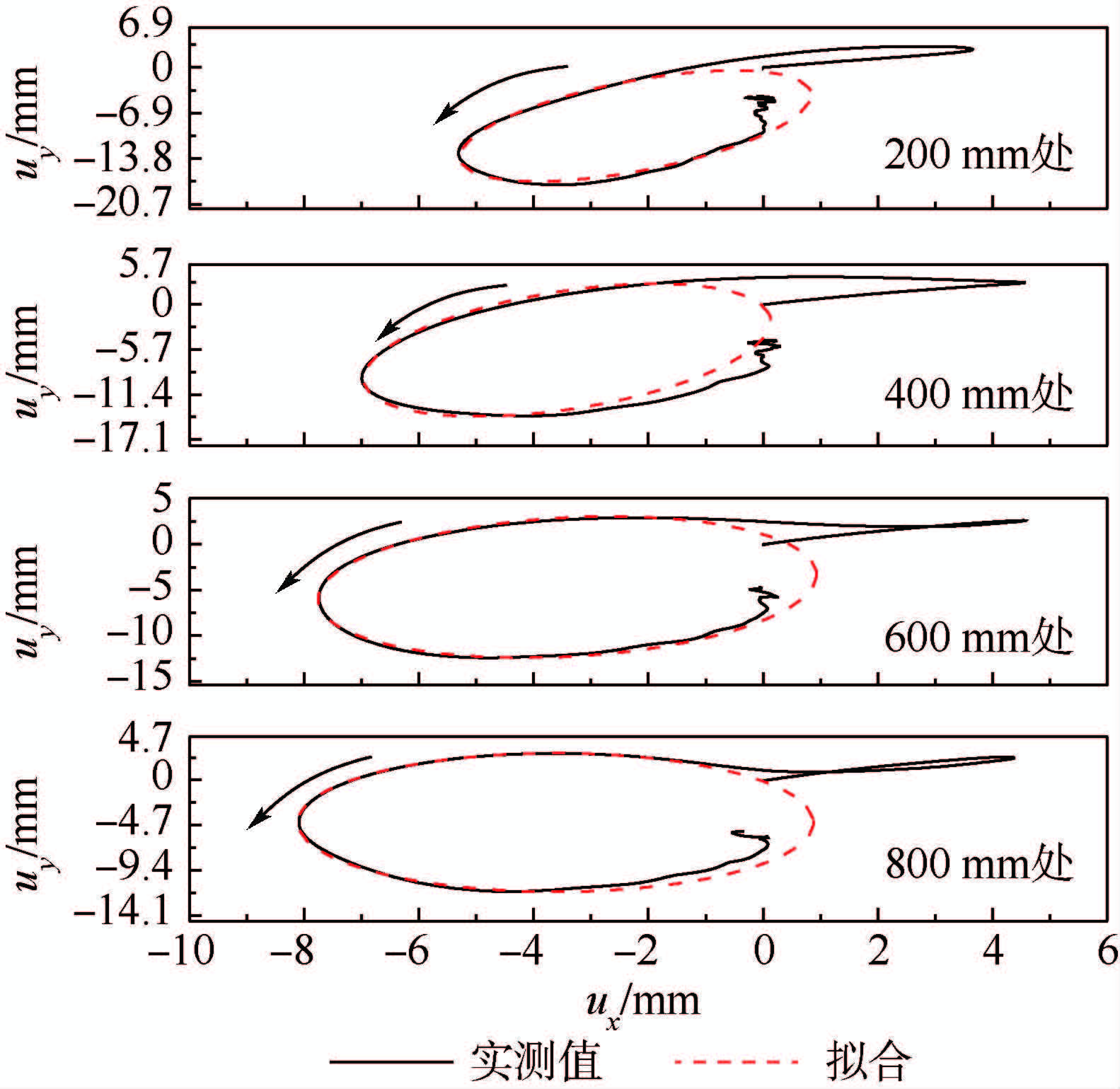 从图 5中可以看到瑞利波存在的大致区域,然而瑞利波在震源附近并不产生,因而为了从该图中得到瑞利波出现的具体时间,需要进一步分析结点位移变化.图 6为距震源200、400、600、800 mm处接收点竖向位移uy关于水平位移ux的变化曲线,4条曲线可近似拟合为椭圆曲线,然而200~600 mm的近似椭圆短轴与x方向成一定的夹角,说明该位置并不形成R波,只可以形成LS波;800 mm的近似椭圆短轴与x方向平行,说明该处已形成瑞利波.