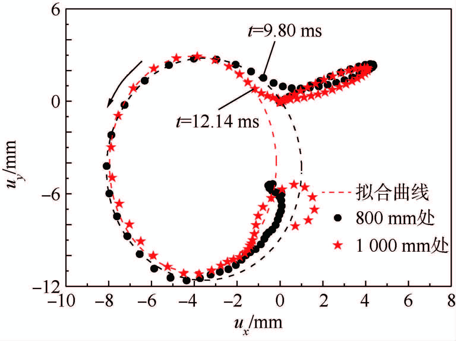 图 7为位于800、1 000 mm处的接收点竖向位移随水平位移变化曲线,结点的运动轨迹分别在t=9.80 ms、t=12.14 ms时刻开始呈现椭圆极化,即说明该时刻已形成瑞利波,且随时间呈逆时针变化.可以看出二者差异很小,位移振幅没有显著的变化,验证了瑞利波在水平方向上低衰减率的特性.同时,可以计算得到瑞利波波速约为85.47 m/s,略小于S波波速,但略大于理论值,见式(17).
