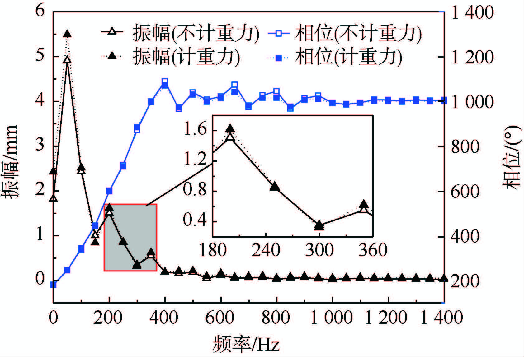 从图 9的振幅曲线中,可以明显观察到3个波峰,波峰所对应的横坐标值即约为该力学模型的前3阶固有频率;重力载荷虽不影响模型固有频率,但对于振幅、相位的影响是显而易见的.表 2为该模型的前5阶固有频率所对应的振幅和相位,可以看出由于重力作用的存在,使得该系统的前5阶频率对于的振幅、相位值都有所提升,振幅增长率分别为11.73%、7.12%、12.44%、19.72%、30.28%.基于考虑重力效应与否对于瑞利波在时域和频域响应都有一定的影响,因而在精细数值模拟中加入重力影响是十分有必要的.