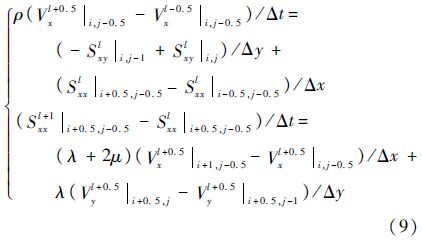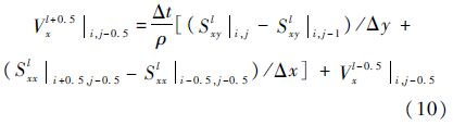 式中:Vx和Vy分别为离散网格中速度V的水平和竖直分量;Sxx、Sxy分别为离散网格中应力S的水平、剪应力分量;Vxl+0.5|i+1,j-0.5表示在t=(l+0.5)Δt时刻,坐标为(x,y)=(iΔx,(j-0.5)Δy)的结点在x方向的速度Vx.由方程式(9),推导得到迭代方程: