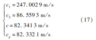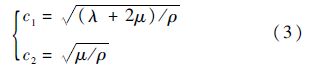 式中:c1、c2和c分别为纵波、横波和瑞利波速;g为重力加速度;k为波数.说明考虑重力影响的瑞利波的波速大小与波数有关,因而可能会发生频散现象.方程左边前2项即为不计重力影响时的瑞利波速方程,第3项是由于考虑了重力影响而附加存在的.c1和c2 的计算公式为