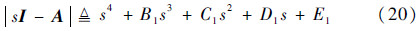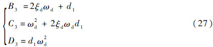 显然应有B1=B2、C1=C2、D1=D2、E1=E2。由于螺旋模态为一阶模态,且时间常数较大,特征根很小,通常情况下d2«min(d1,ωd),因此D1≌d1ω2d,并且d2≌E1/D1。然后将特征行列式写成: